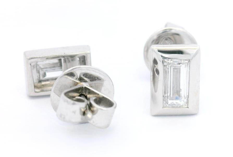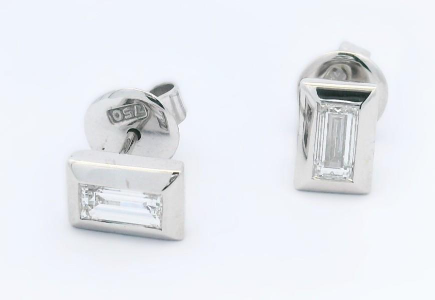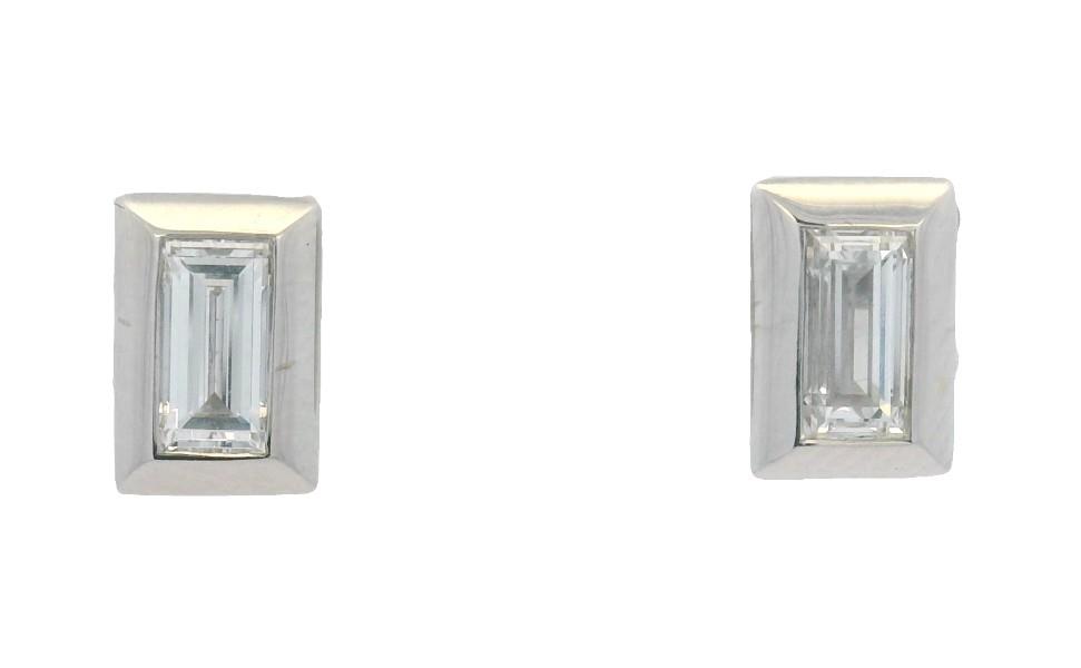 18ct white gold, featuring a pair of well matched rectangular step cut Diamonds, totalling 0.71ct, thick bezel set, pierced post with backings. Measurements: 7 x 5mm. GIA Certification Available. Total Weight: 2.8g