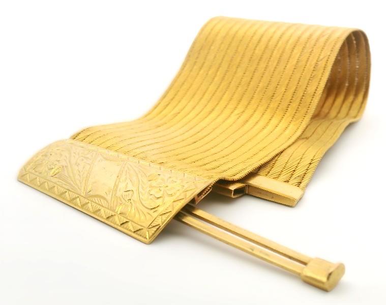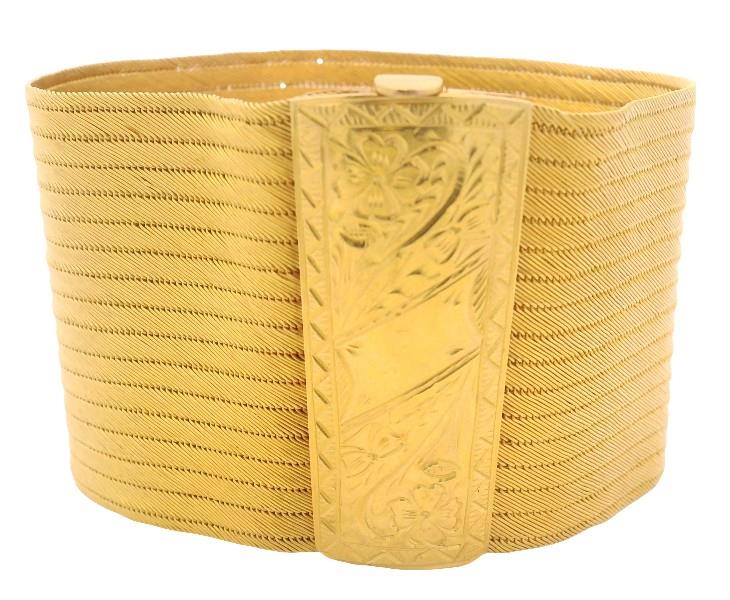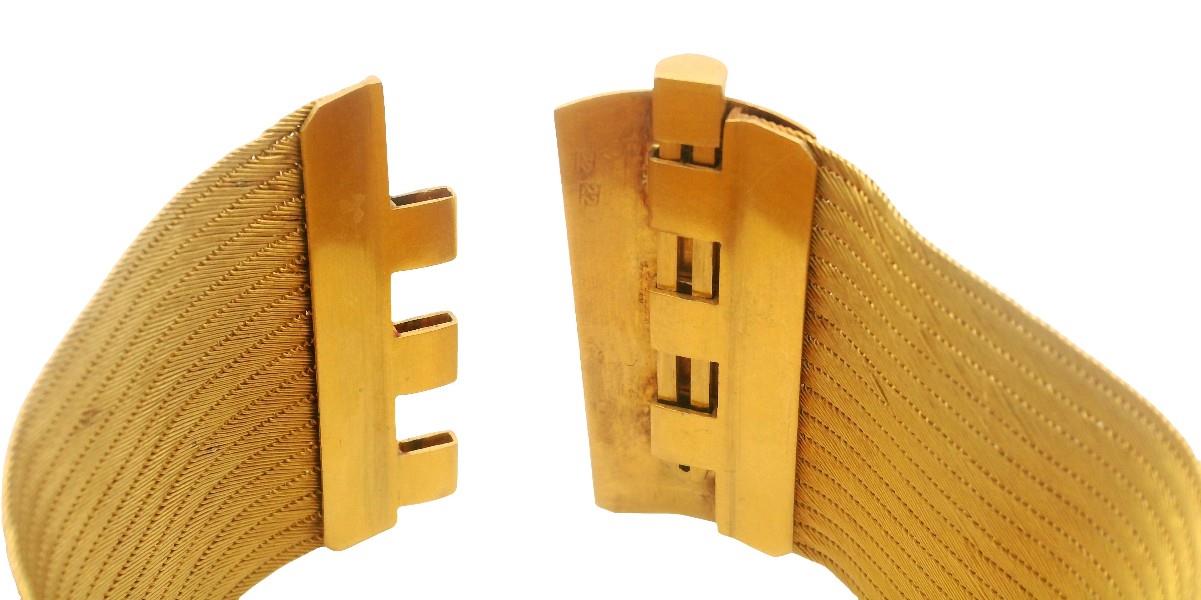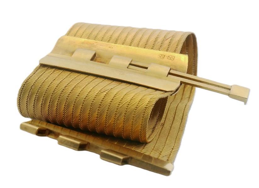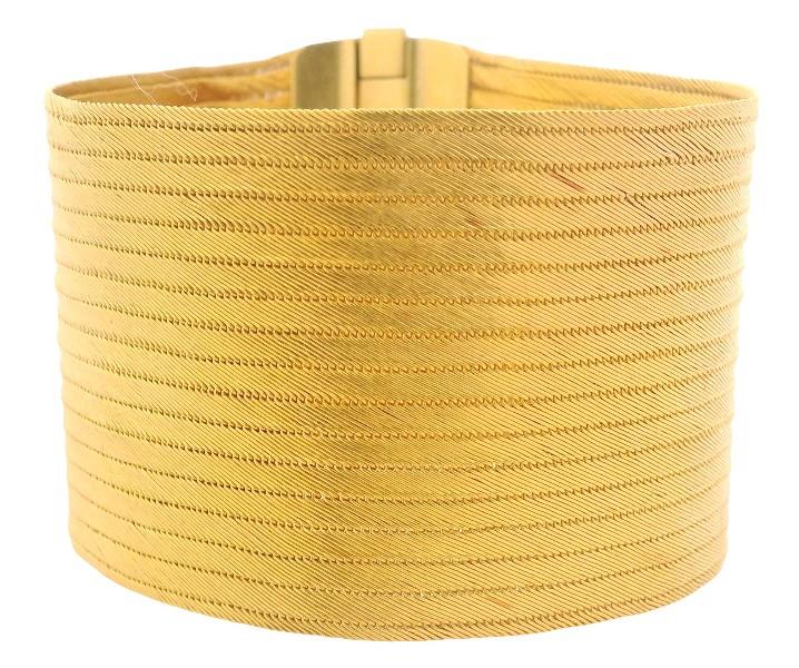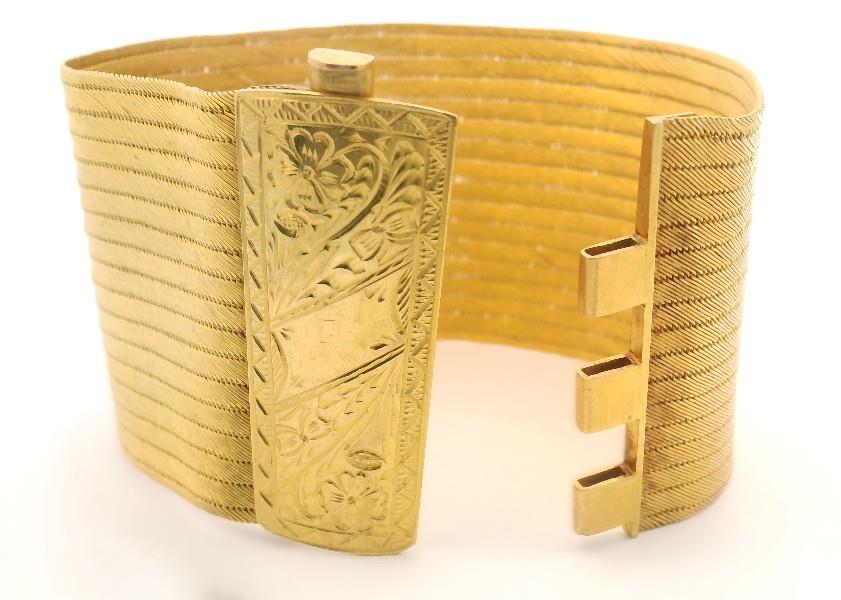 22ct yellow gold, stamped 22, presented as a 4cm wide multi row woven style panel of smooth interlocking patterned gold, the satin finish panel capped at each end with an angled rail of polished engraved gold work, fitted with traditional pin style clasp. Designed to sit in a flared form to the wrist. Narrow Length: 17cms Wide Length: 18.5cms