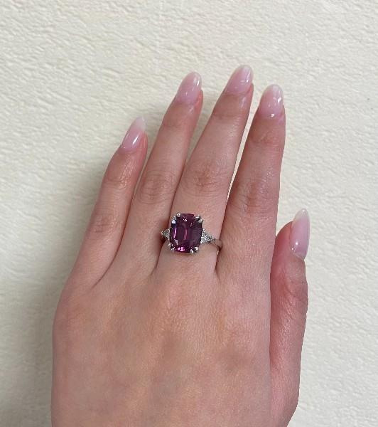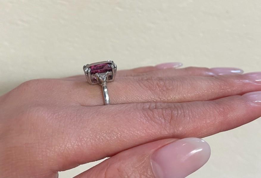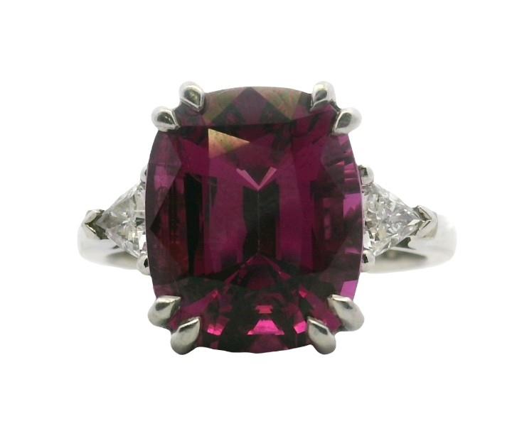 Platinum, fully hallmarked South Africa, presented as a striking solitaire styled dress ring, featuring a cushion cut Rhodalite garnet of intense raspberry colour, weighing approx. 7.50ct, measuring 12.3 x 10mm, double claw set at four points, flanked by single trillion cut diamonds to each shoulder, totalling 0.40ct, merging to a smooth heavy band. Ring Size M Valuation on request.