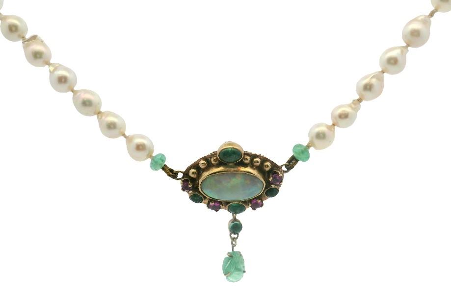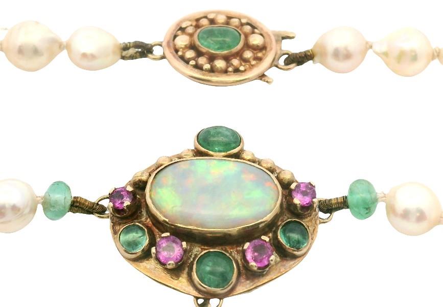 9ct yellow gold to both clasp and feature pendant hallmarked to both L.A. the semi baroque strand of small pearls connecting to the feature pendant, of modern Etruscan style, oval in shape with central cabochon white opal bezel set, framed by four cabochon round emeralds and four faceted pink sapphires, suspending a double emerald drop, the lower carved and claw set, completed with similar styled smaller clasp, gold and emerald detailed. Length: 42cms Total Weight: 25.8grams