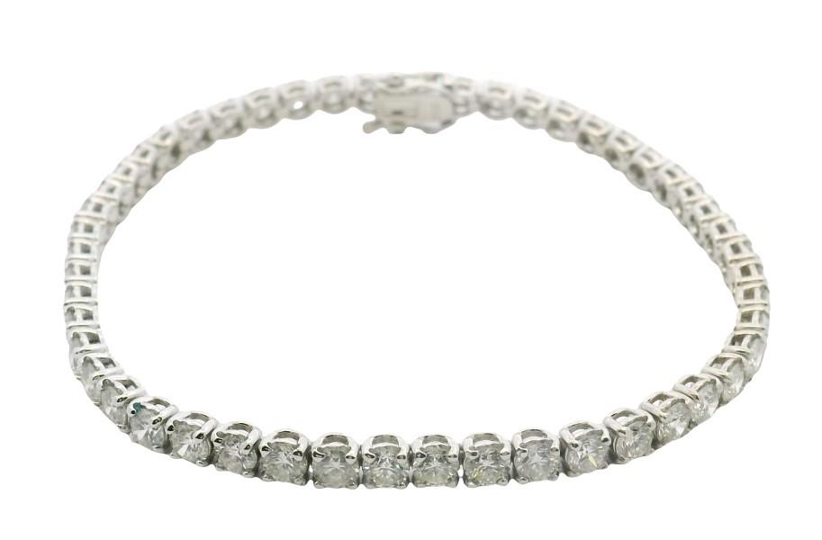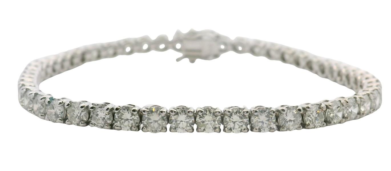 18ct white gold, featuring fifty round brilliant cut Diamonds, totalling 7.80ct, claw set, individual basket setting, in a semi flexible bracelet measuring 18cm long, complete with groove and tongue clasp, secure with double side latches. Valuation on request. Total Weight: 11.5g