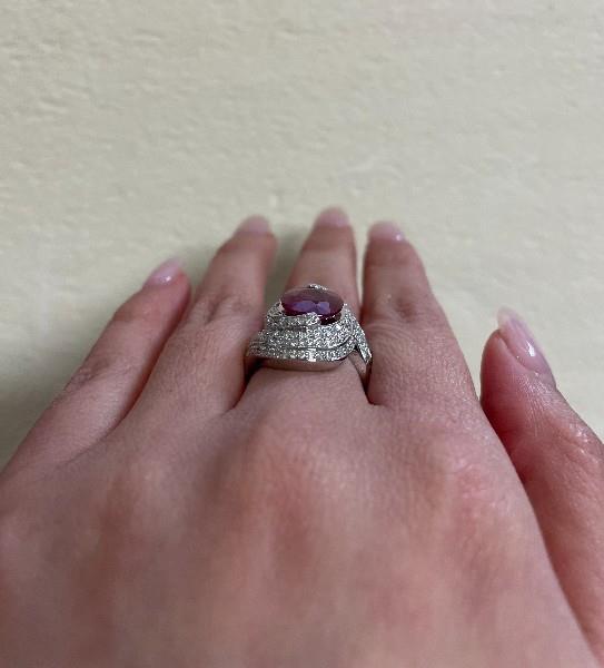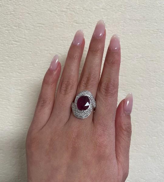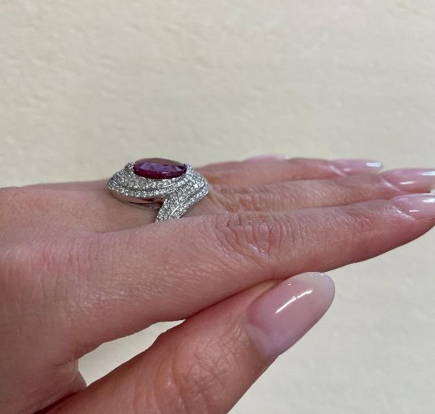 14ct white gold, featuring an oval cut Ruby, totalling 4.02ct, medium to dark red, partial bezel set by a swirl halo with slight overlay, lined by three rows within, set with round brilliant cut Diamonds, extending to the offset shoulders, totalling 0.87ct, claw set, creating a dome profile, merging into a polished flat band. Ring size: N. Valuation on request. Total weight: 6.6g