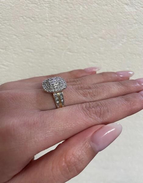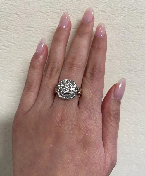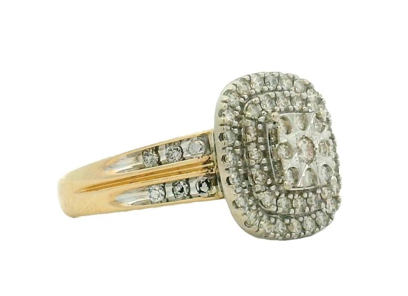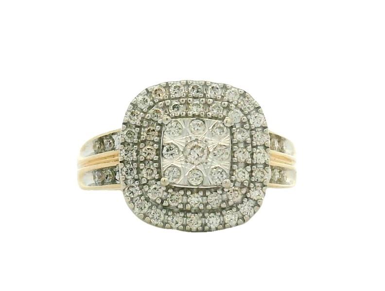 9ct yellow gold with rhodium plating to diamond set section, presented as a double cluster styled dress ring of square cushion shape, centrally featuring nine brilliant cut diamonds illusion set in a raised panel, stepping down to two bead claw set frames of smaller diamonds, completed on double diamond set band tapering to reverse, raised to allow a straight band to sit alongside. A.T.D.W.: 0.80ct.