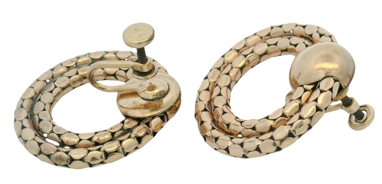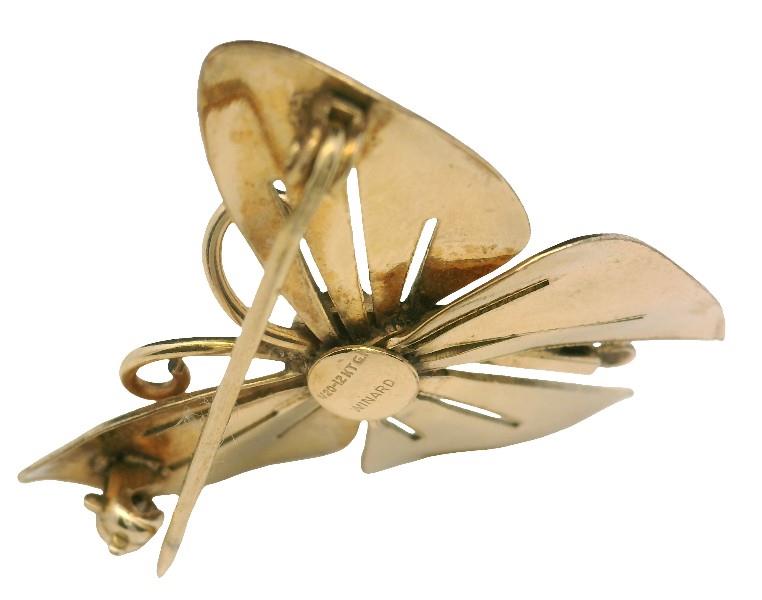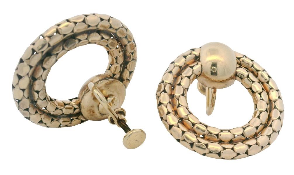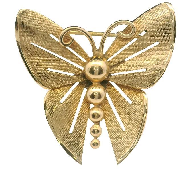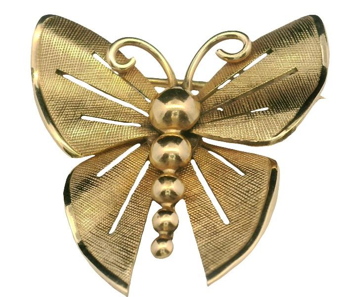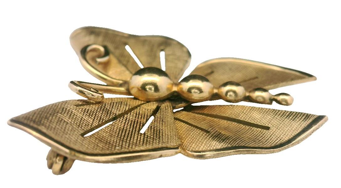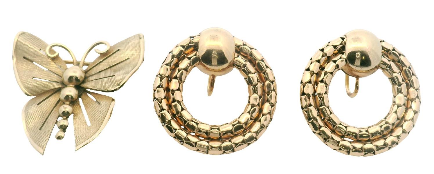 Both yellow gold plated, stamped, the earrings featuring a polished gold domed disc to top as stud, suspending two fixed rings of concentric gold link, the fancy pattern identical to both, completed with screw on fittings, along with a gold plated stylised butterfly brooch, etched and polished in finish, completed with pin, measuring 3.5cms in length. Earring Length: 2.8cms