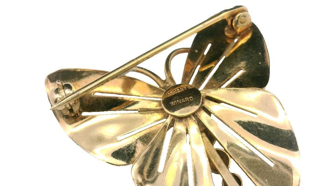 A PAIR OF GOLD PLATED DISC EARRINGS AND BUTTERFLY BROOCH