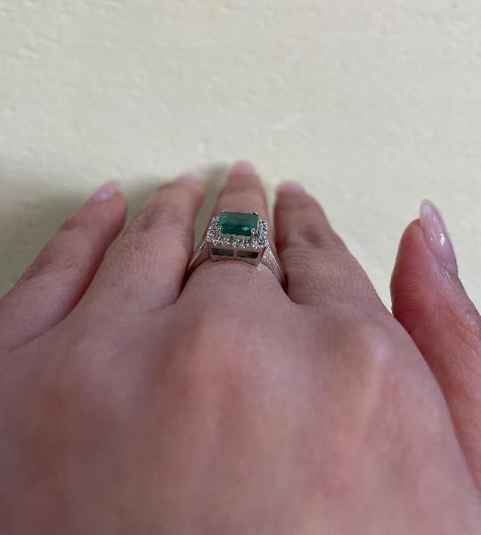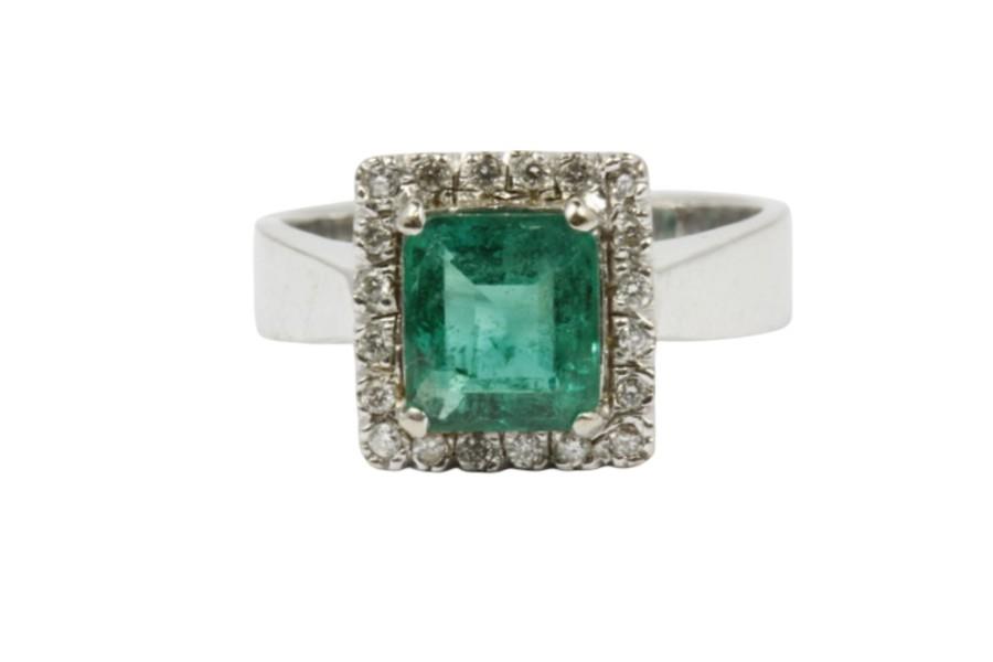 AN 18K W.G VIBRANT EMERALD CUT EMERALD OF 1.30CT & DIAMONDS CLUSTER RING, SIZE: N1/2, T.W.: 6.2GRAMS