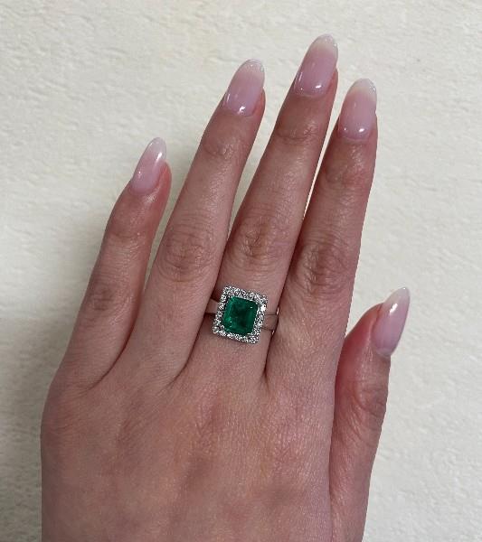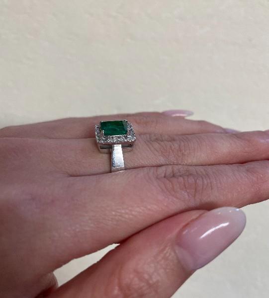 18ct white gold, stamped 18k, crafted as a simple square edged rectangular shape cluster of low profile, centrally set with an emerald cut emerald of intense strong green colour, weighing approximately 1.30ct, corner bead claw set, framed by a fine surround of small brilliant cut diamonds in white gold work, completed of tapered band with square edged profile. Ring Size N1/2.