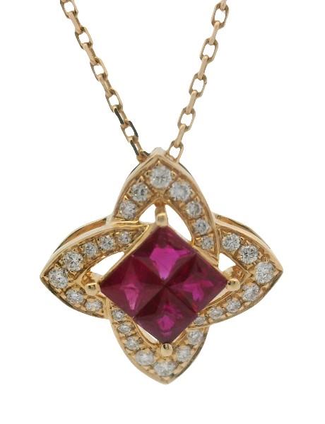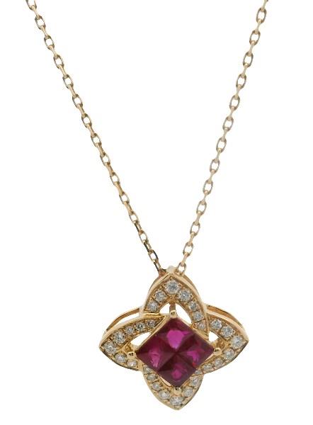 18ct yellow gold, featuring four centre square scissor cut Rubies, totalling approximately 0.50ct, medium vibrant red tones, claw set, arranged into a kite shape, surrounded by a floating interconnected halo, made up of round brilliant cut Diamonds, claw set, concealed bail, presented on bright belcher link chain with two length adjustment rings. Chain Length: 40, 45cm. Total Weight: 2.9g