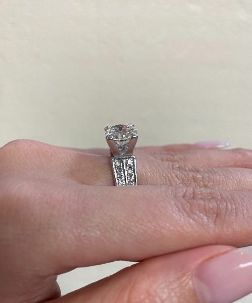 14ct white gold, Circa: 1970's, presented as a bold raised claw set solitaire featuring central brilliant cut diamond of approximately 2.66ct, in four claws with pronounced "U" shaped gallery detail, flanked by a double grain set diamond band set with twenty further small stones, totalling 0.44ct, tapering to reverse. Valuation on request. Ring Size L.