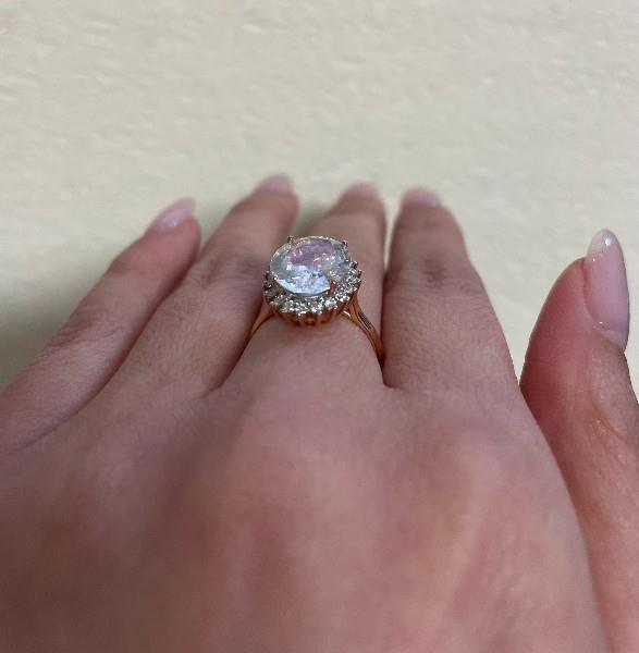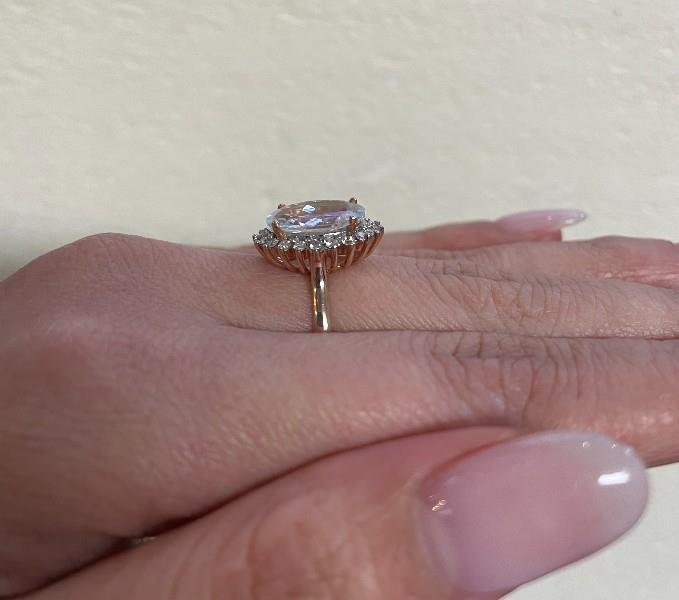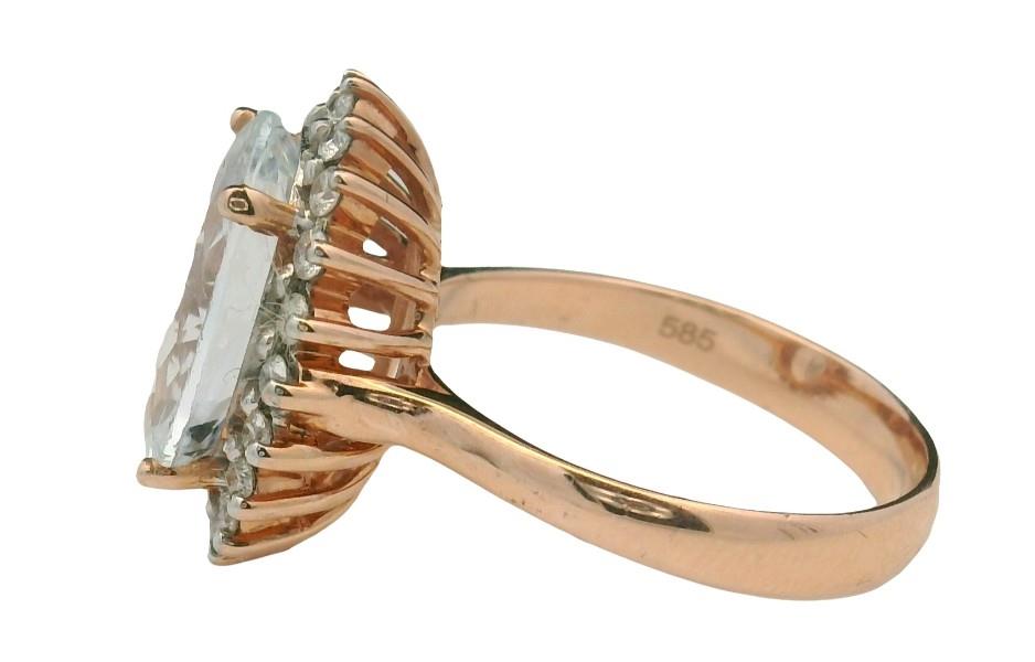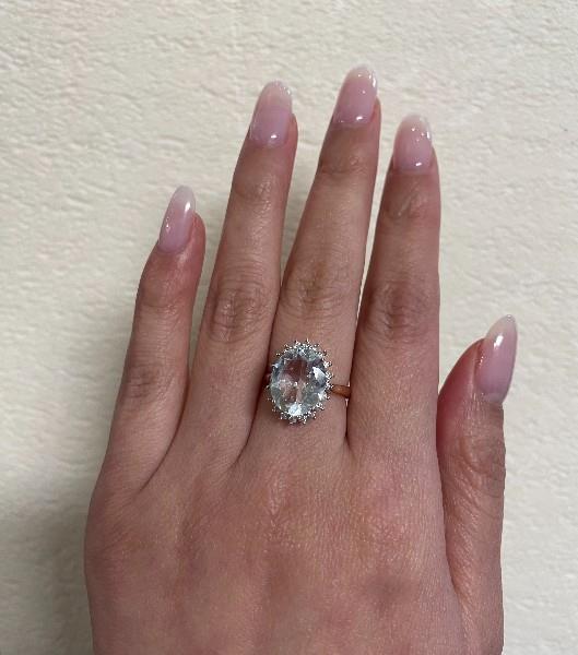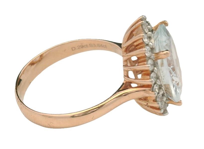 A 14K R.G OVAL CUT AQUAMARINE OF 3.84CT & DIAMOND CLUSTER (.29CT) RING, SIZE: K1/2, T.W.: 4.2GRAMS