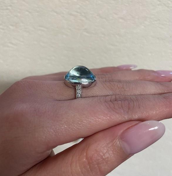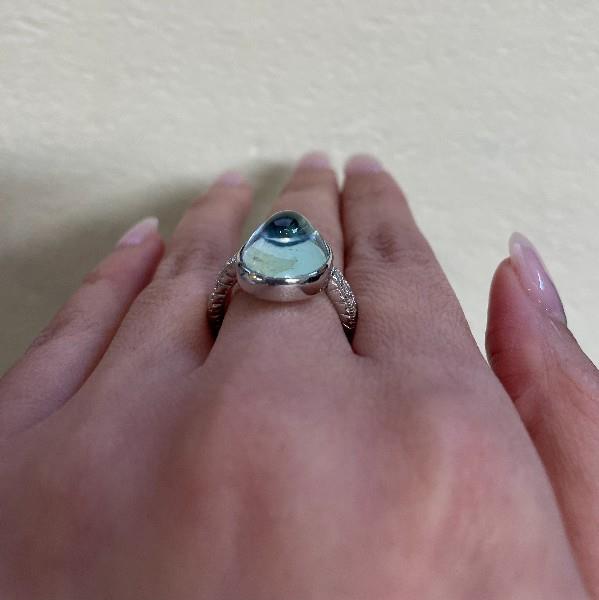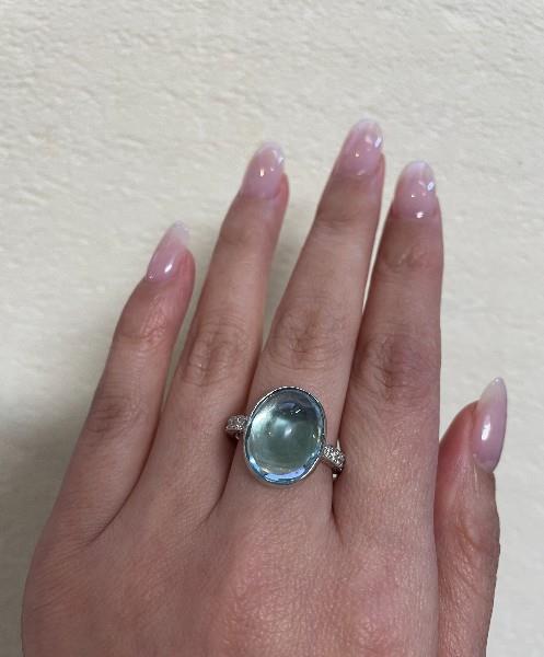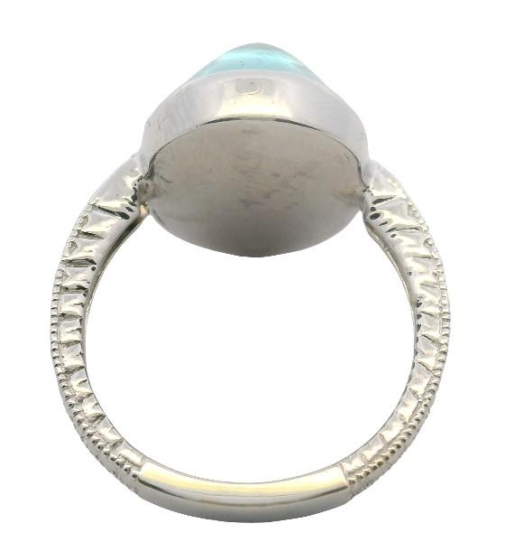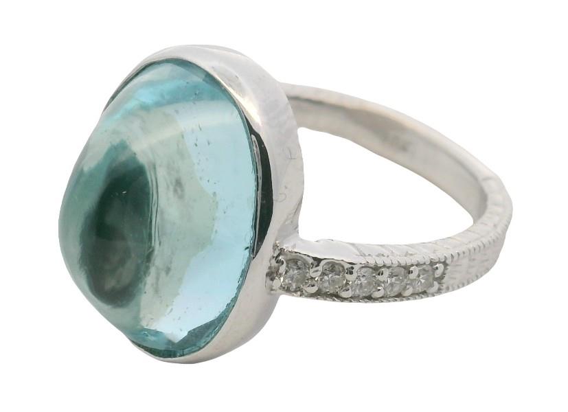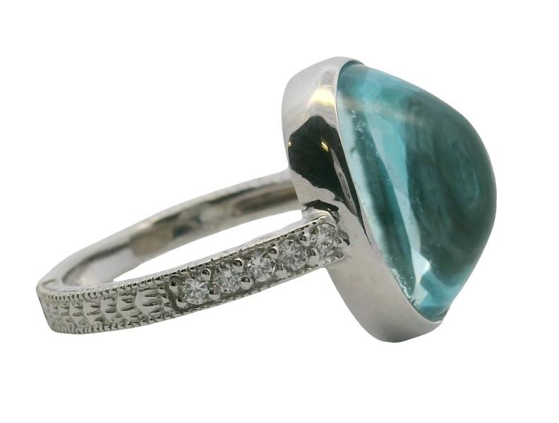 18ct white gold, stamped, featuring an oval cabochon cut blue Topaz of approximately 12.75ct, bezel set, closed back, sitting on Diamond set shoulders, set with round brilliant cut Diamonds, totalling 0.22ct, shared bead set, merging into an etched detailed, square edge band to a polished section at reverse. Ring size: O. Total Weight: 8.4g