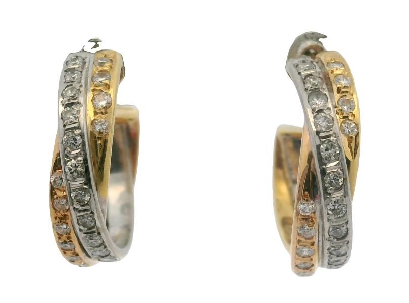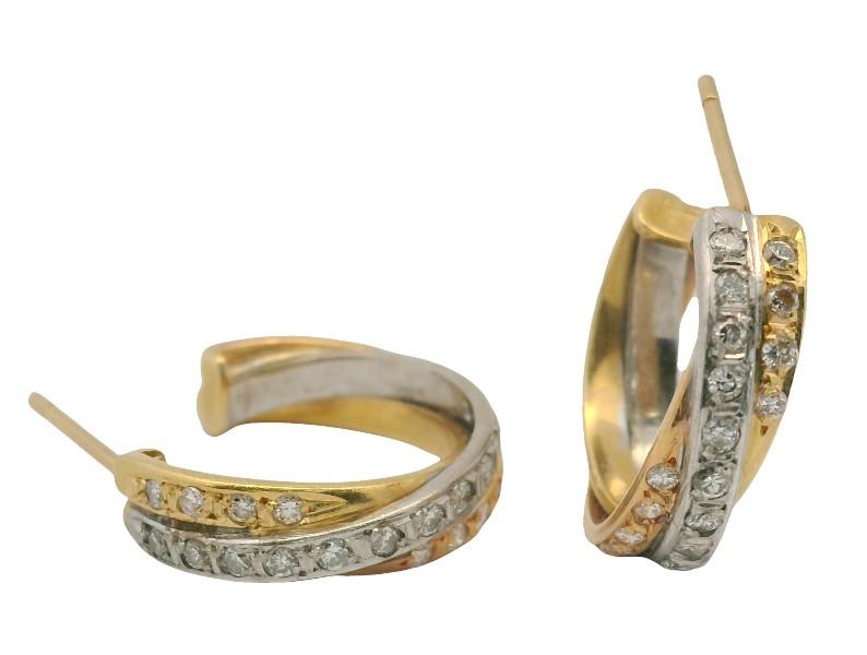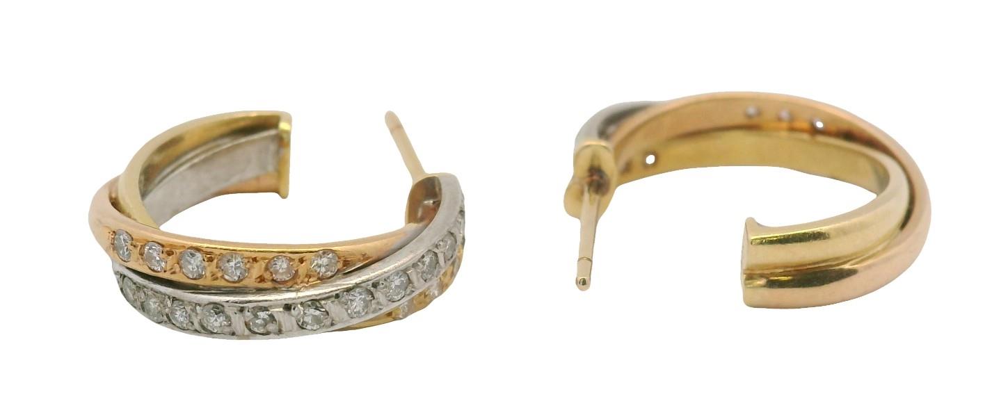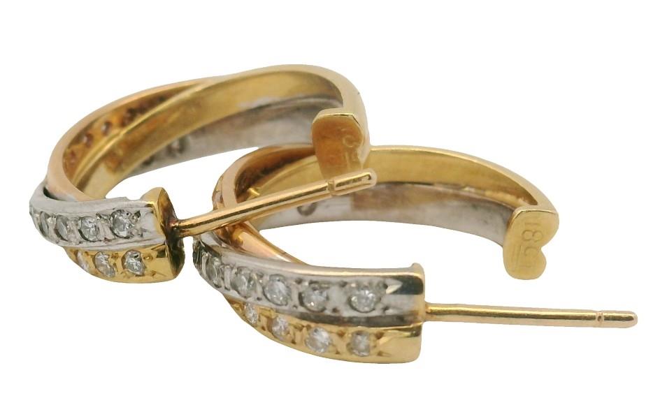 18ct yellow and white gold, stamped, presented as two tone overlapping hoops of open ended design, measuring 1.8cms in diameter, each section set with brilliant cut diamonds, completed with pierced posts.
