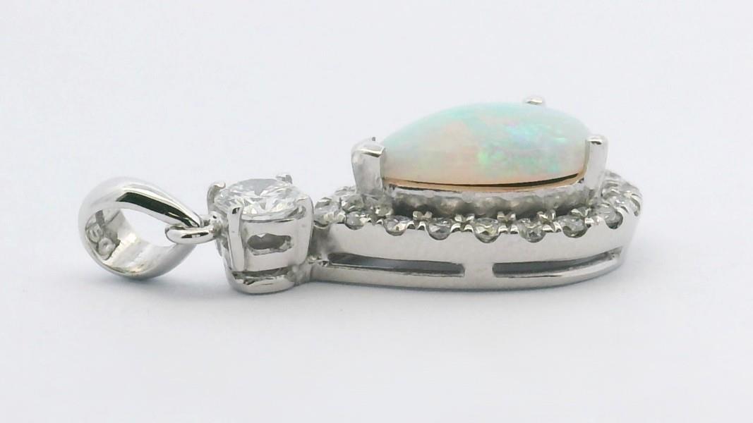 18ct white gold, featuring a pear shape cabochon, totalling 1.18ct, jelly body colour with flashing play of colours displaying purple and greens, claw set, closed back, surrounded by a halo of round brilliant cut Diamonds and detailed above by a larger round brilliant cut Diamonds, claw set, totalling 0.72ct, on polished tapered bail. Height: 2.5cm. Total weight: 3.1g