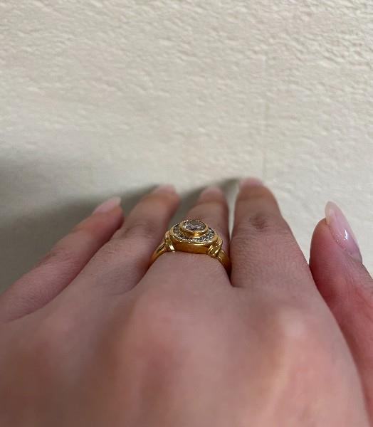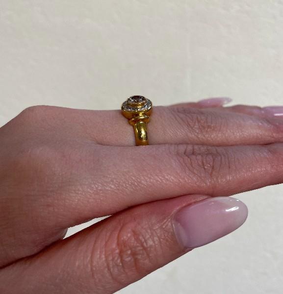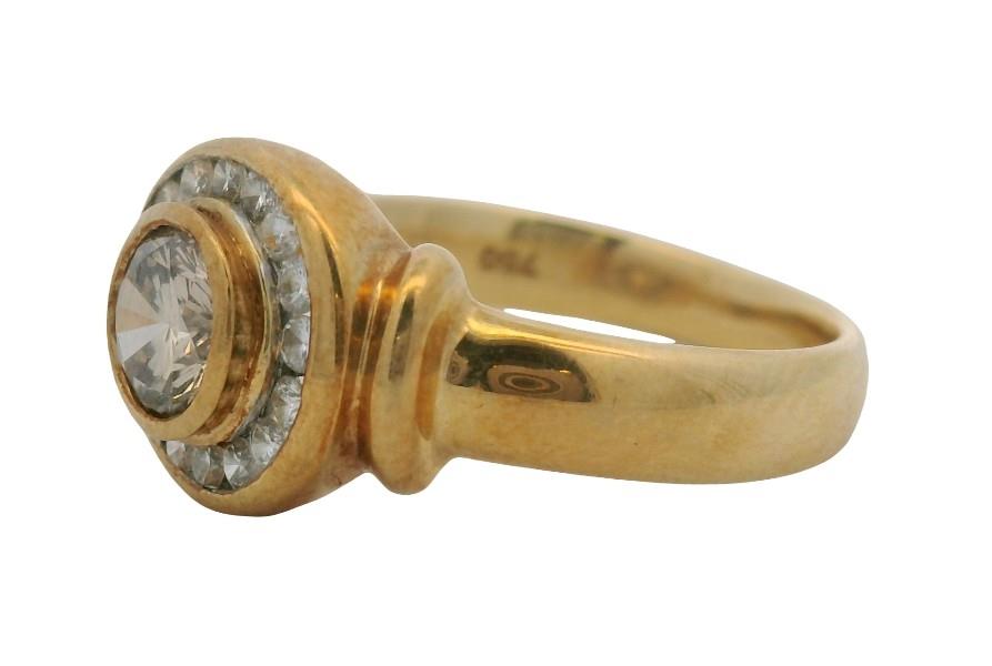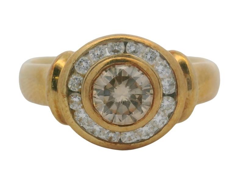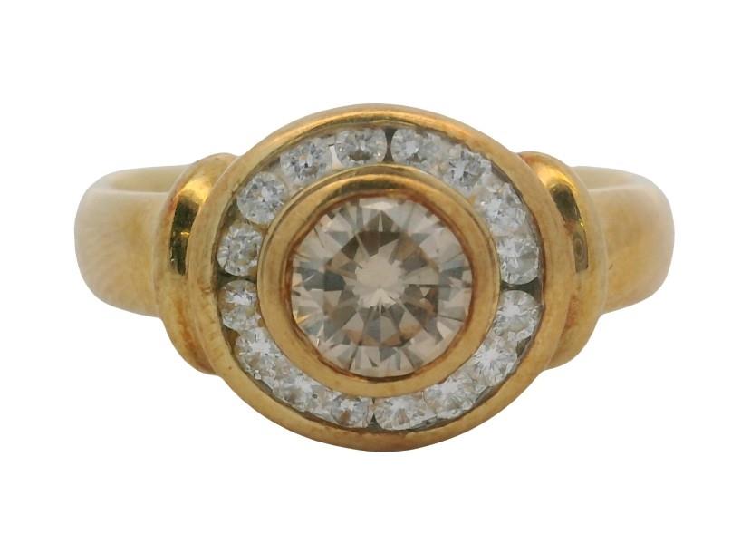 18ct yellow gold, stamped 750 PM, indicating Precious Metals, presented as a low profile modern round cluster, featuring a central champagne coloured brilliant cut diamond of approximately 0.35ct, bezel set, framed by a fine channel set surround of small white brilliant cuts, totalling approximately 0.20ct, rolled detail to each shoulder, merging to a smooth tapering band. A.T.D.W.: 0.55ct. Ring Size K