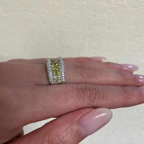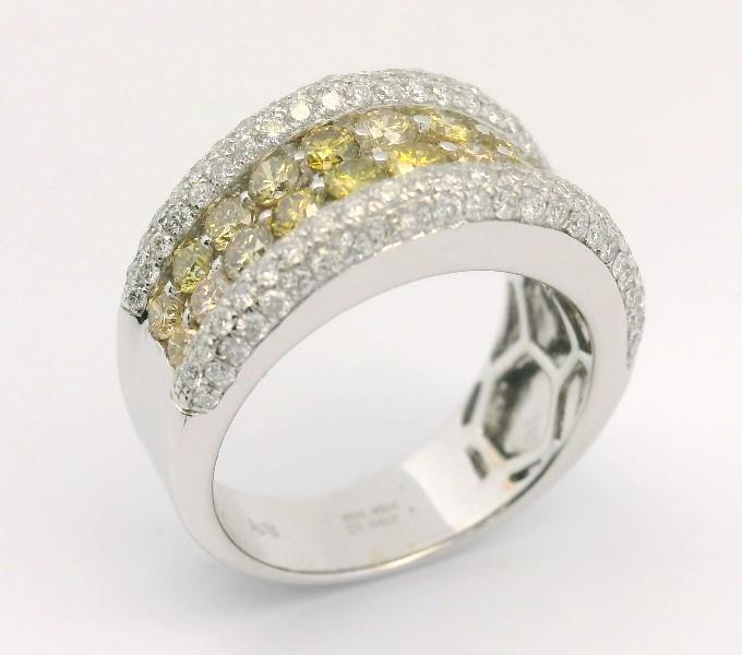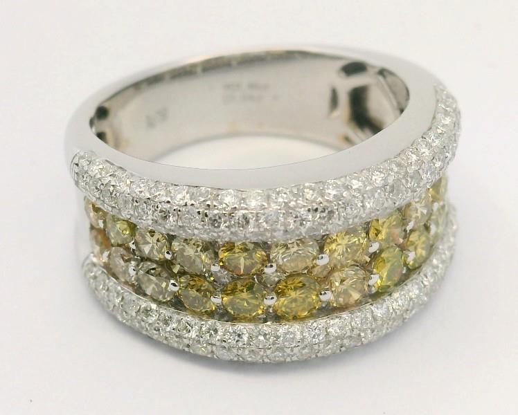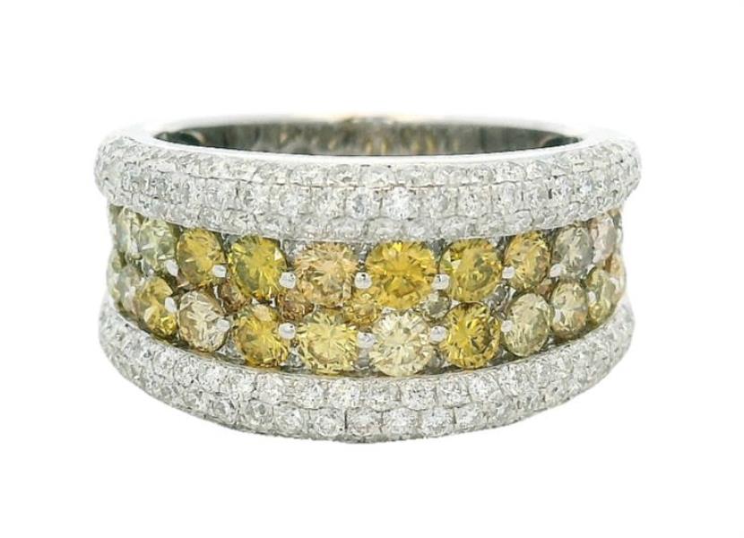 18ct white gold, featuring two centre rows of fancy yellow round brilliant cut Diamonds, totalling 1.46ct, bead set, bordered round brilliant cut Diamonds, 1.04ct, pave set rounded profile, merging into a polished band of slight taper at reverse. Ring size: M. Total Weight: 7.1g