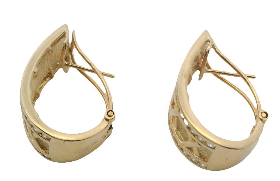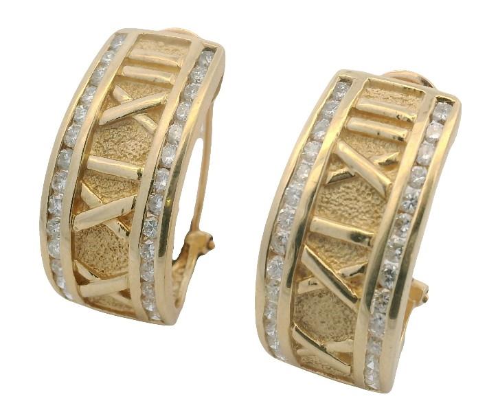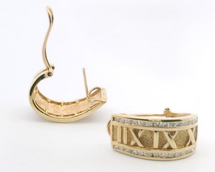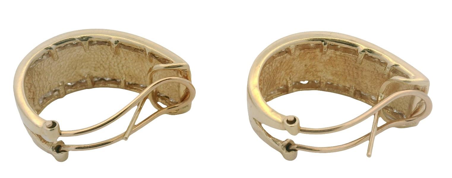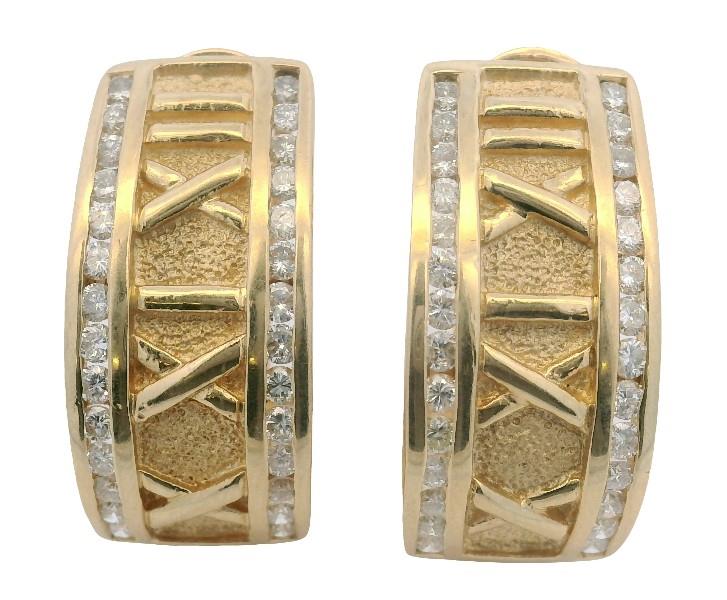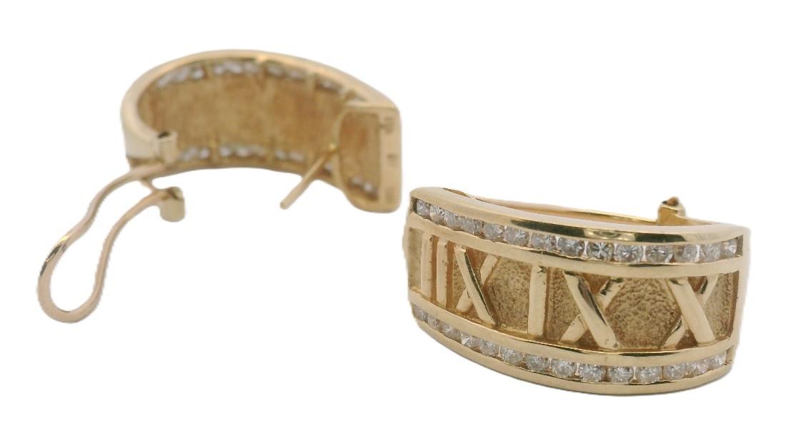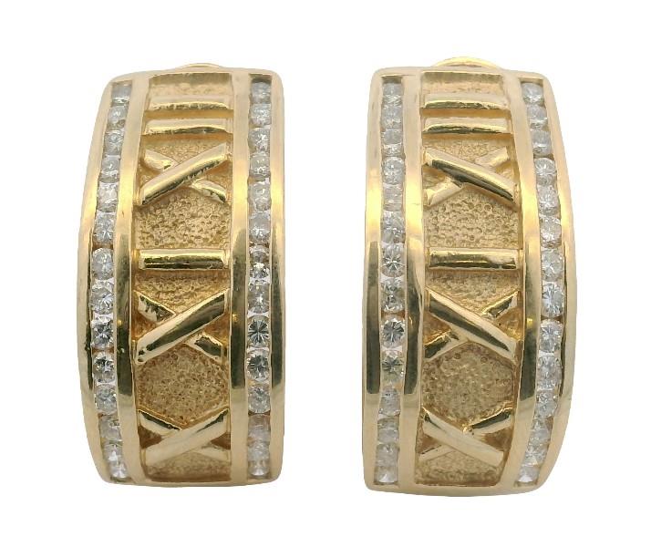 14ct yellow gold, stamped 14ct with unknown makers mark, presented as wide 11mm wide half hoop earrings, each centrally detailed by raised Roman numerals in polished relief, set against a textured gold finish background, each edged diamond set, completed with pierced posts and sprung open clip backs. Length: 2.3cms
