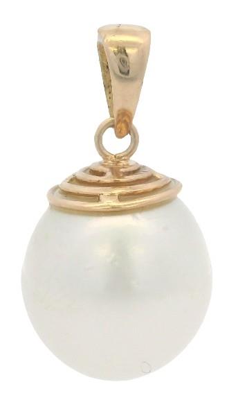 18ct yellow gold fitting, featuring an oval shape white South Sea Pearl pendant, measuring 14mm, white body colour with silvery overtones, drilled and capped with a maze coil, fitted with a polished tapered bail. Height of pendant: 27mm. Total Weight: 5.3g