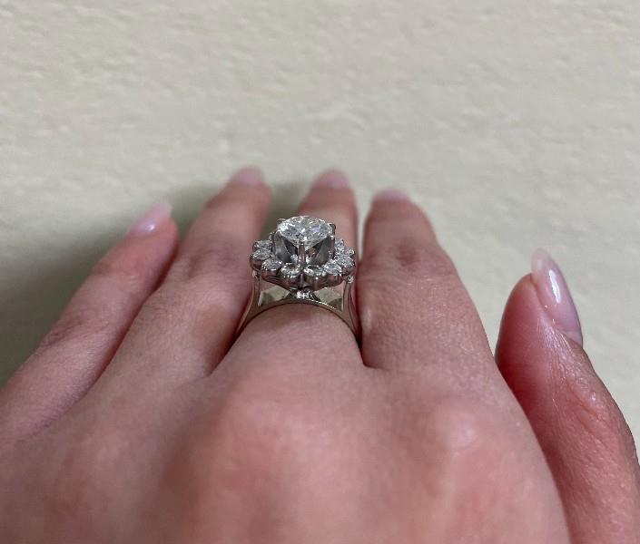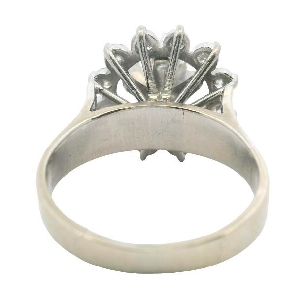 18ct white gold, presented as an upswept round floral styled cluster featuring a central brilliant cut diamond of approximately 1.40ct, six bead claw set, framed by a spaced outer frame of smaller brilliant cuts, twelve in total totalling approximately 0.66ct, finished on a scooped band. Valuation on request. Ring Size L.