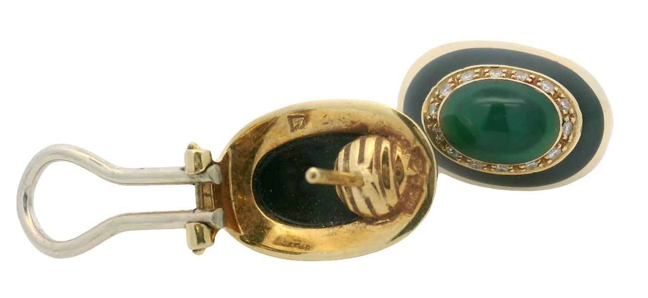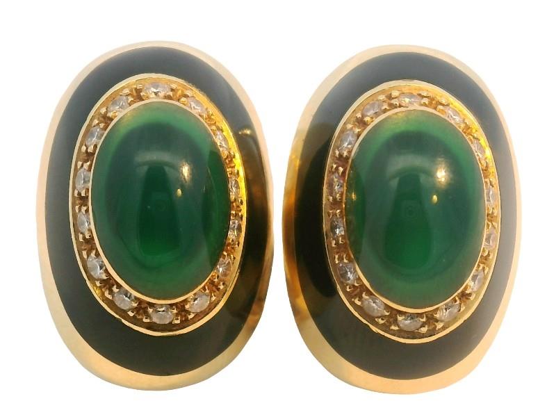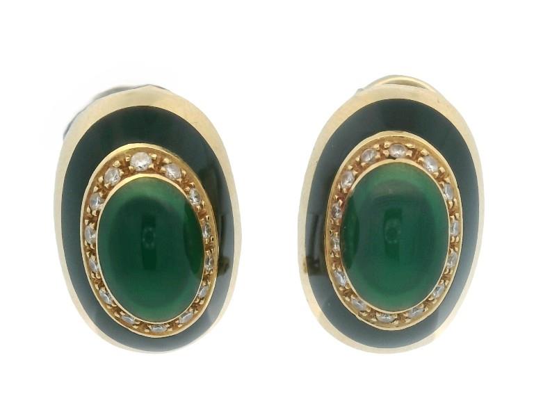 18ct yellow gold, stamped 750 with makers mark, presented as oval domed form stud earrings, each measuring 18 x 13mm, featuring to centre a cabochon piece of emerald green resin, grain set within a frame of small brilliant cut diamonds, further framed by a rail of black enamel with gold to outer, completed with pierced posts and sprung open clip backs. N.B. can be converted to clip on only.