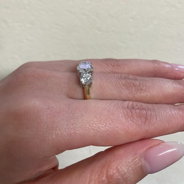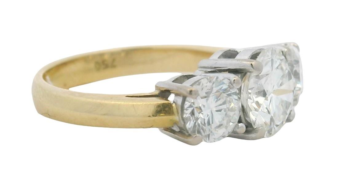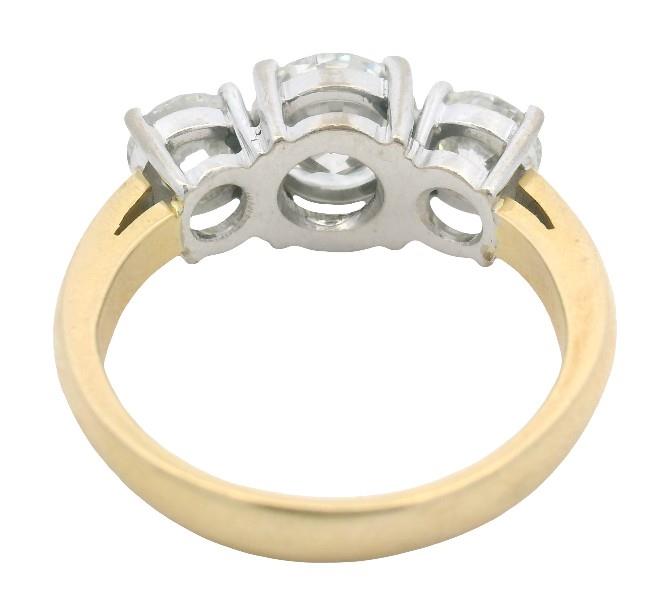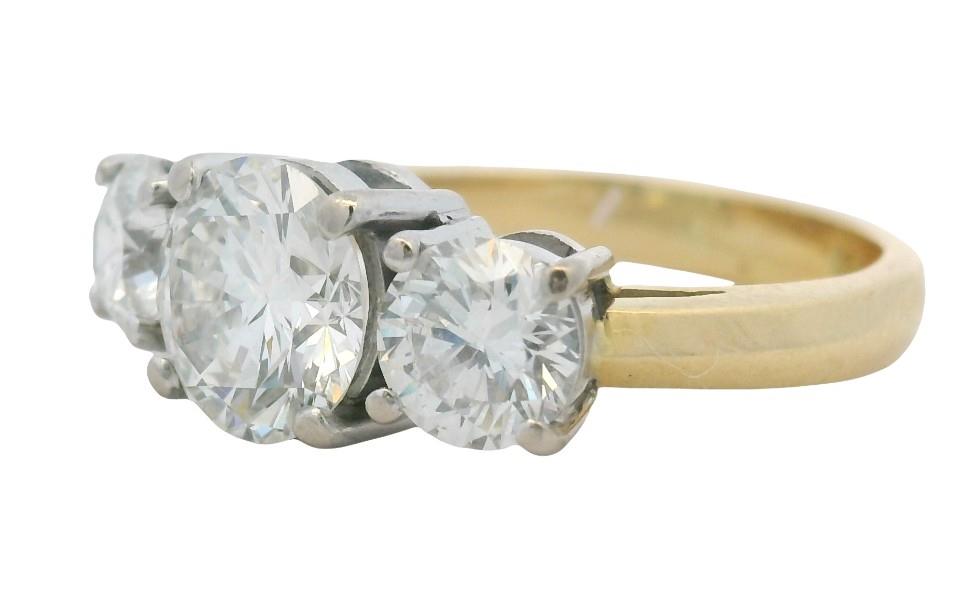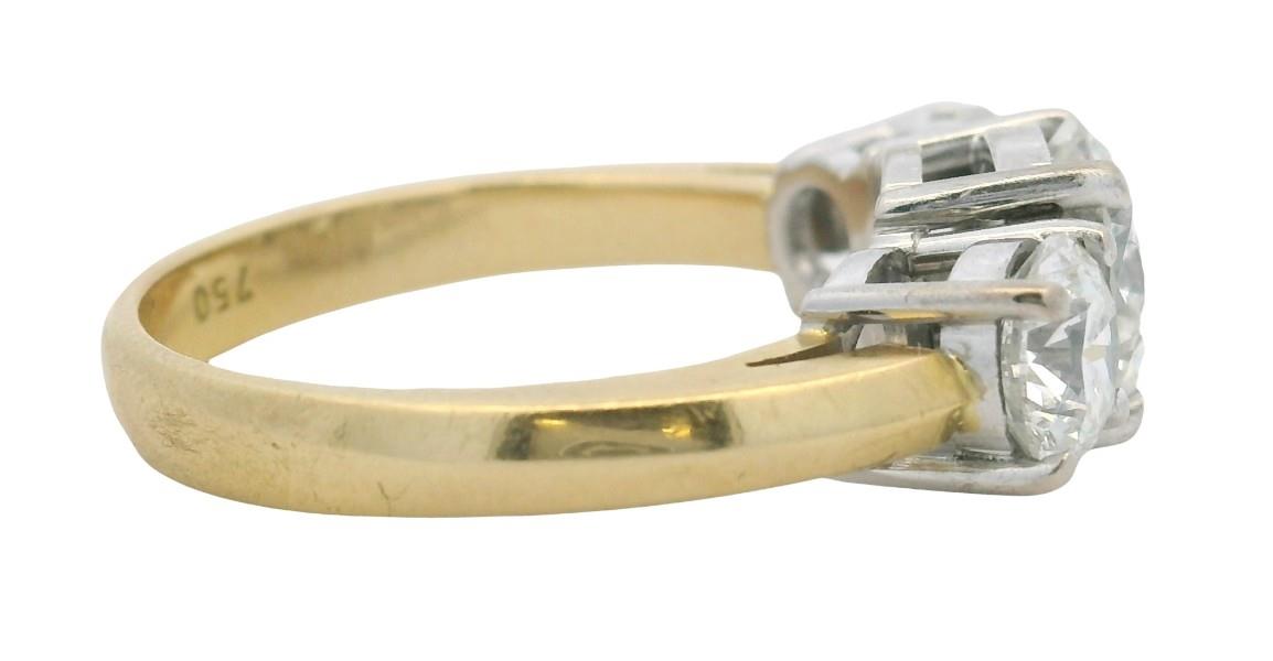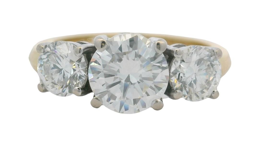 18ct yellow and white gold, crafted as a simple classic three stone diamond ring of graduated size, the central diamond GIA certified weighing 1.50ct, bead claw set in four corner claws, flanked by two smaller matched quality GIA certified brilliant cuts totalling 1.23ct, also claw set, merging to a yellow gold knife edge band. Original Authenticity Certificates Available for each stone. Valuation on request. A.T.D.W.: 2.73ct Ring Size N1/2
