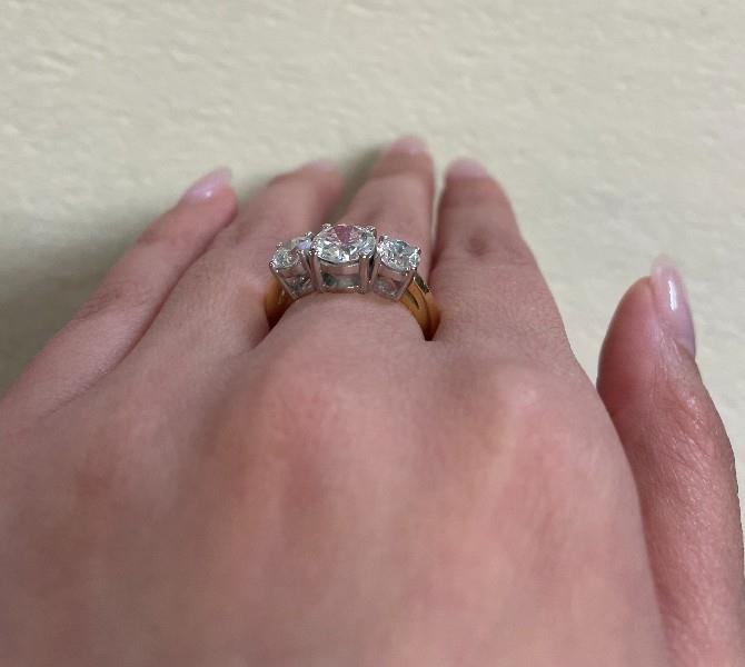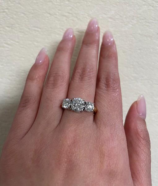 A 18K Y/W GOLD GIA THREE STONE BRILLIANT CUT DIAMOND RING TOTALLING 2.73CT, SIZE: N1/2, T.W.: 5.8G