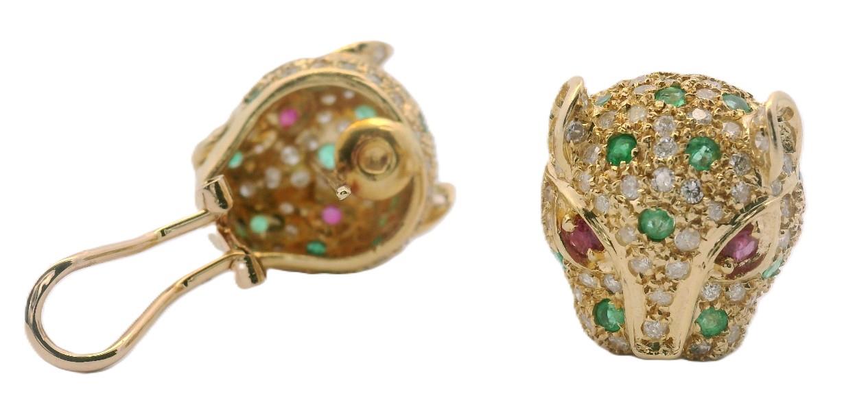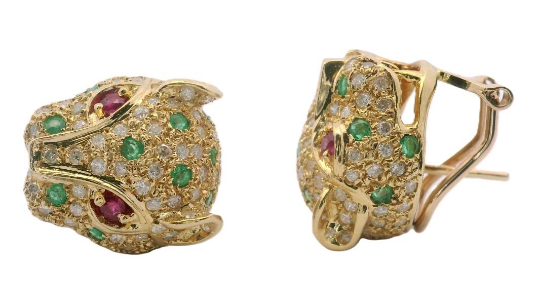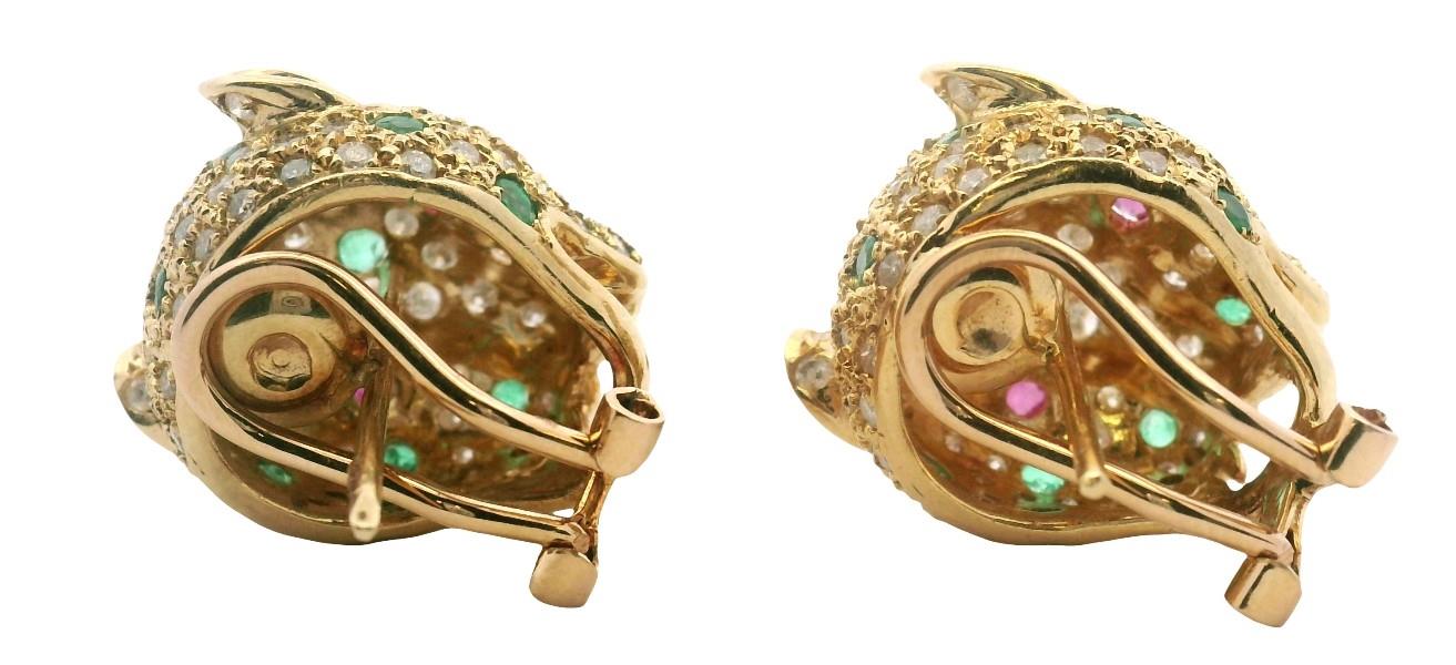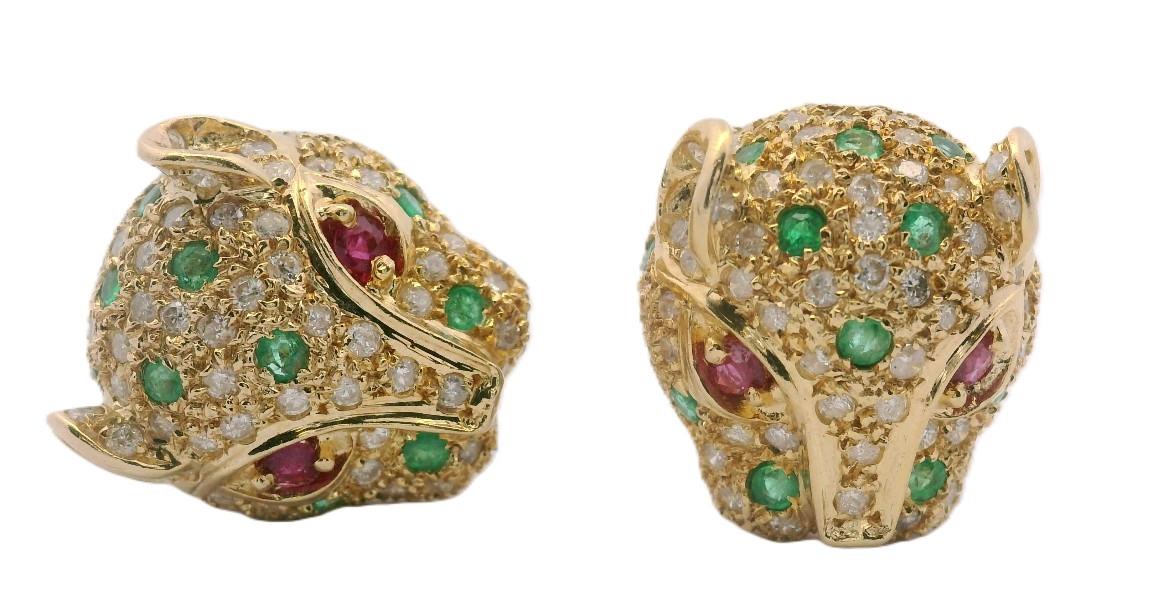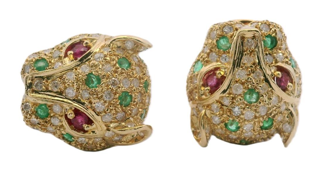 14ct yellow gold, stamped GJ, presented as stylised panther heads, each pave set throughout with brilliant cut diamonds and highlighting emeralds, embellished to eyes with feature rubies, polished rails frame, completed with pierced posts and sprung clip backs. Length: 1.8cms