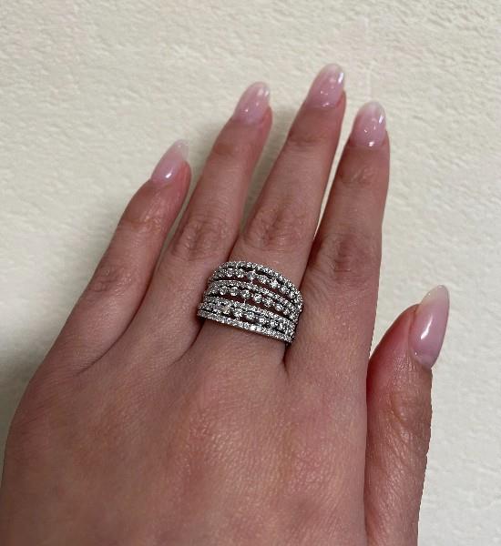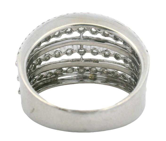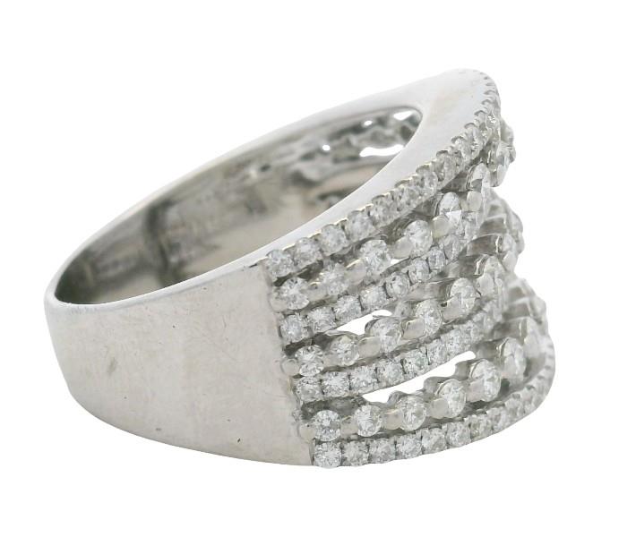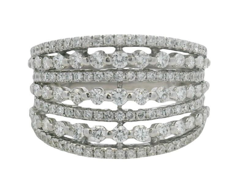 18ct white gold, designed as seven alternating diamond set rails, four of finer grain set style, spaced by three of shared claw technique, the brilliant cut diamonds running across also of tapering size, each rail spaced, connecting to a smooth wide single band. A.T.D.W.: 1.80ct. Ring size: N1/2. Total Weight: 6.6g
