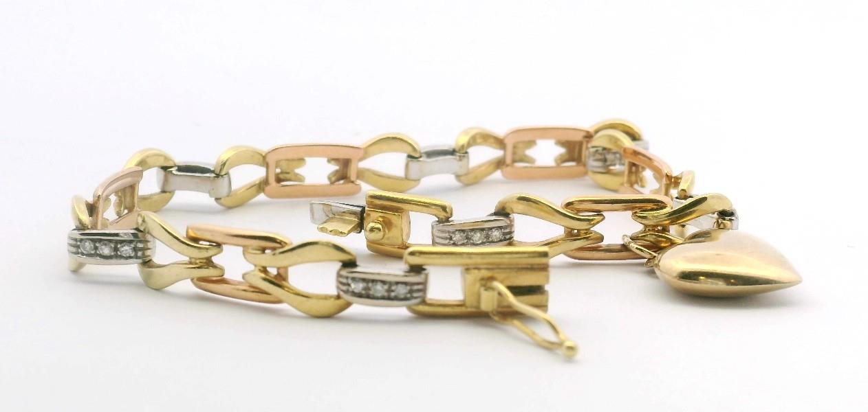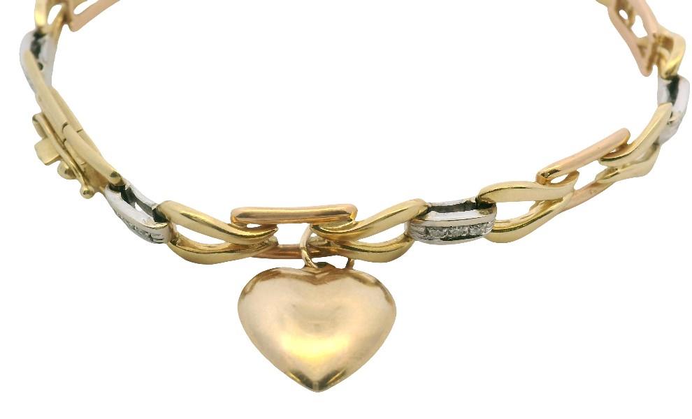 A STYLISH DIAMOND FANCY LINK TRI 18K Y/R/W GOLD BRACELET, 9K HEART PENDANT, T.W.: 16GRAMS, 18.3CM