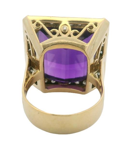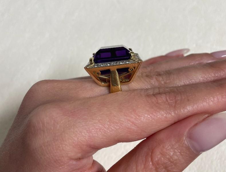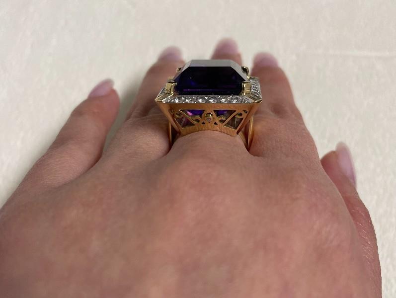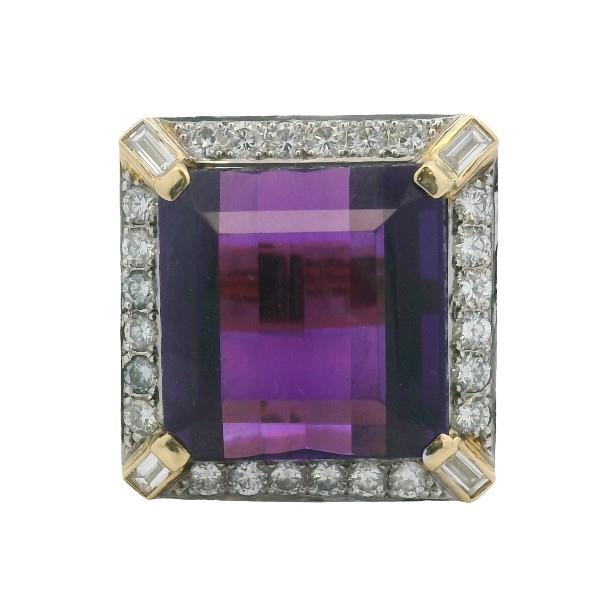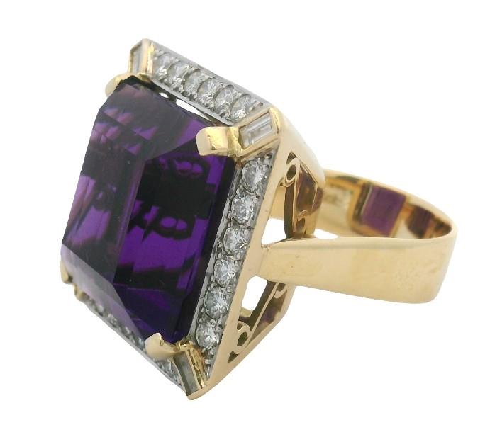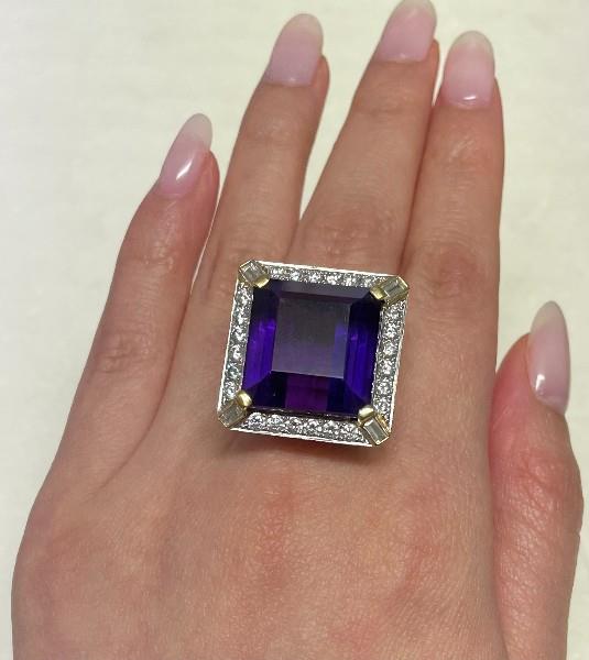 18ct yellow gold, stamped, made as a square shaped cluster of bold size, featuring an intense deep vibrant purple amethyst of approximately 21.80ct, claw set to centre within a frame of smaller brilliant cut diamonds, totalling approximately 1.44ct, further detailed to each corner with a radiating baguette cut diamond detailing, the gallery further diamond set, merging to a wide smooth gold band. Ring Size Q. Valuation on Request
