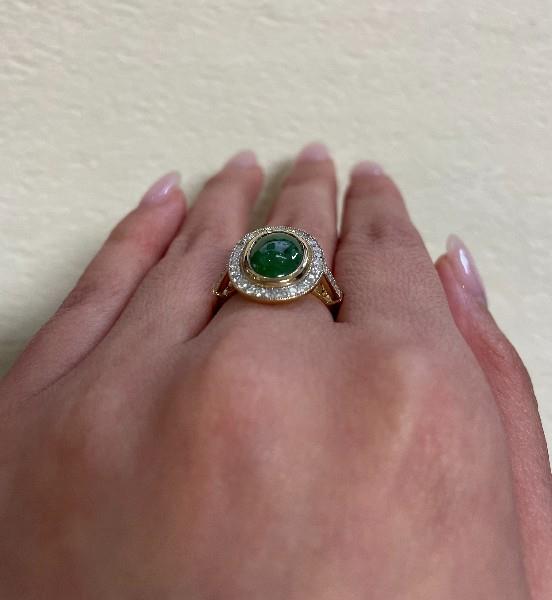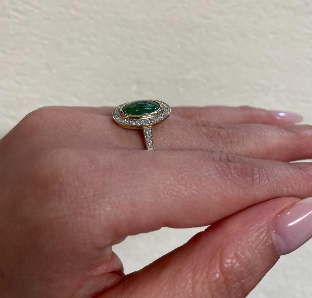 A 10K Y.G OVAL CABOCHON GREEN JADE & DIAMOND(.55CT) HALO RING, SIZE: N1/2, T.W.: 4.6GRAMS