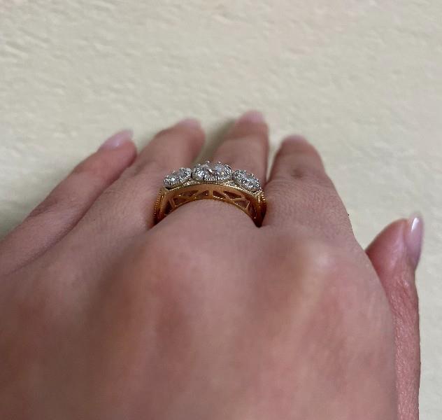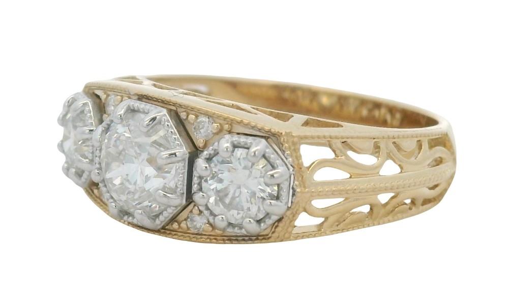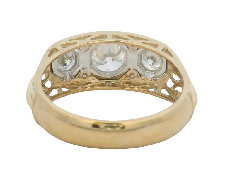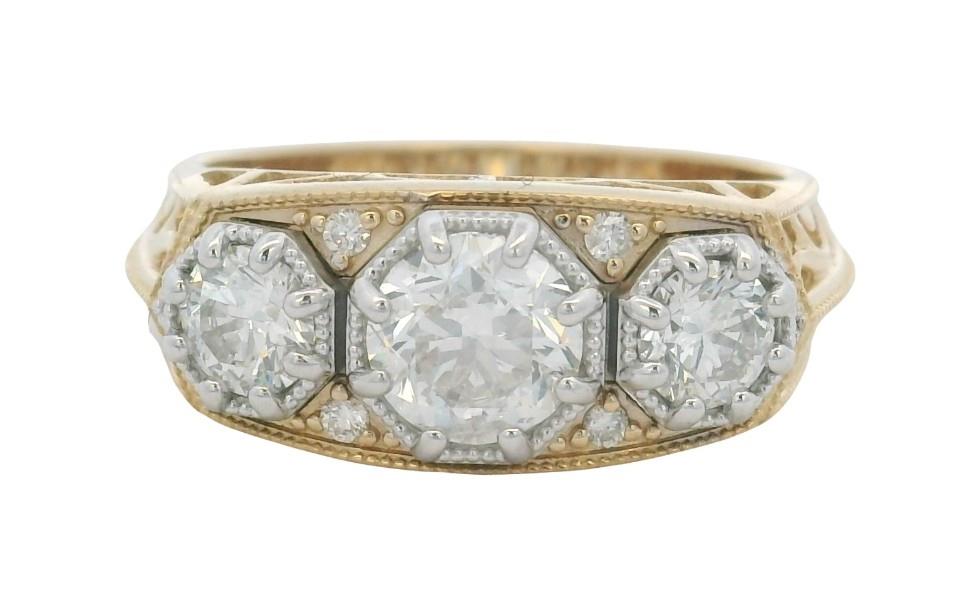 14ct yellow gold, featuring a centre round brilliant cut Diamond, flanked by two smaller round brilliant cuts, totalling 1.49ct, multi claw set in white gold, set amongst the gaps are four brilliant cut Diamonds, totalling 0.04ct, half scroll pattern into pierced openwork across the underbridge and drop shoulders, merging into a half round band at reverse. Ring size: O. Valuation on request. Total weight: 4.9g