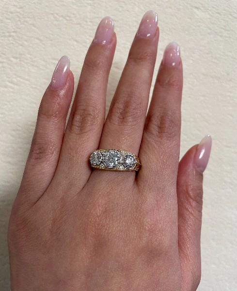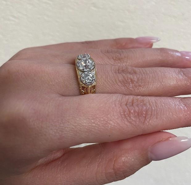 A 14K Y.G DIAMOND TRILOGY ANTIQUE STYLED HALF HOOP DRESS RING TOTALLING 1.50CT APPROX, SIZE: O