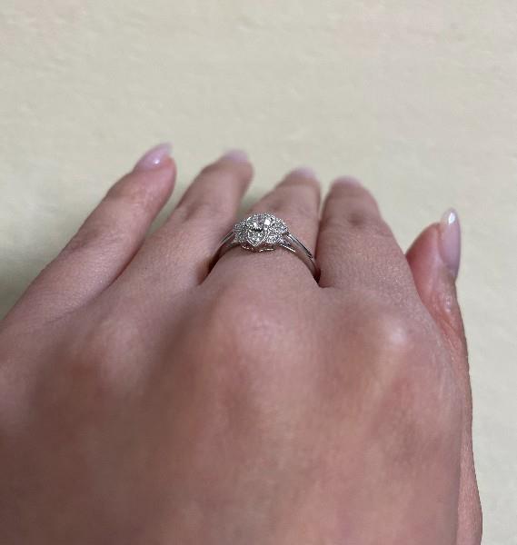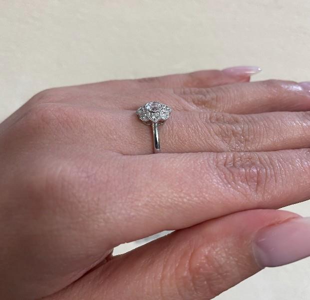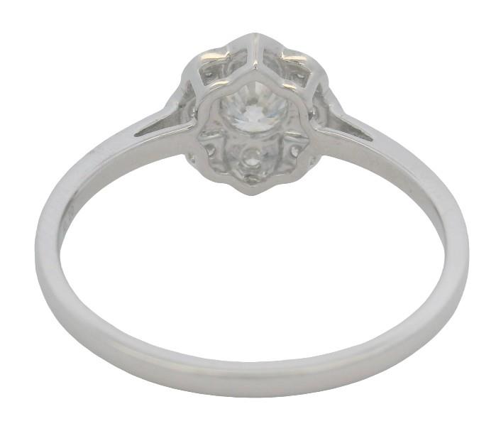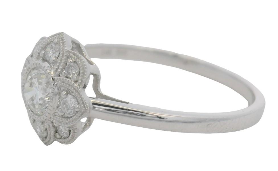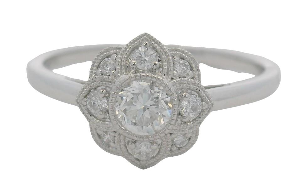 14ct white gold, featuring a centre round brilliant cut Diamond of 0.31ct, bezel set, surrounded by four petal shapes set with small round brilliant cut Diamonds, and four semi fan shapes at the crescents, with smaller round brilliant cut Diamonds, claw set, totalling eight with a combined weight of 0.10ct, highlighted by double beaded millgrain edges, mille grain detailing throughout, merging into a half round band. A.T.D.W.: 0.41ct. Ring size: O. Valuation on request. Total Weight: 2.0g