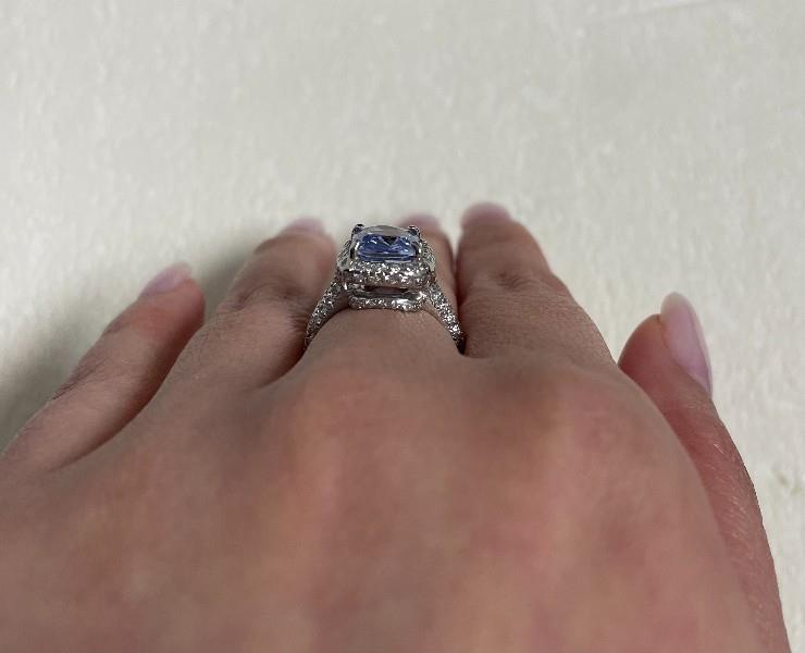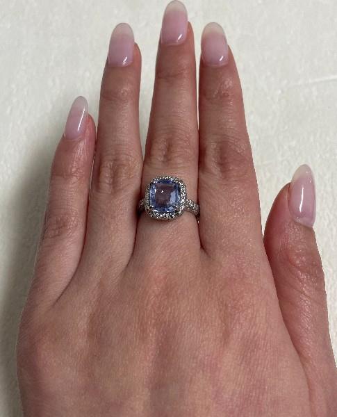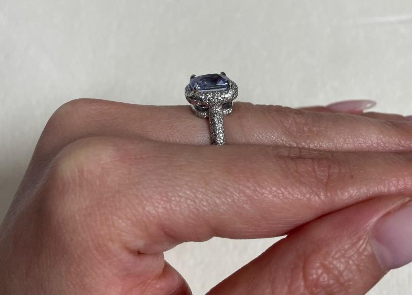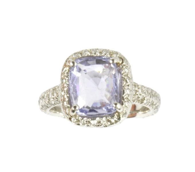 Platinum, stamped, of rectangular cushion shape with a halo style cluster frame, set with central cushion cut sapphire of light violet blue colour, measuring 9 x 7.4mm, weighing approximately 2.50ct, claw set within a frame of tiny diamonds, further small diamonds set to gallery, completed on a rounded band with three fine pave set rails of diamonds set, merging at back to a plain section. Ring Size I. Valuation on Request