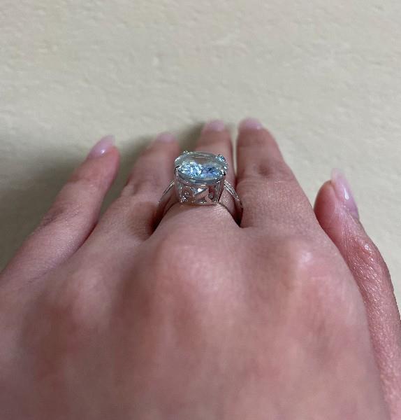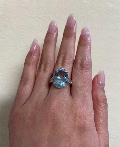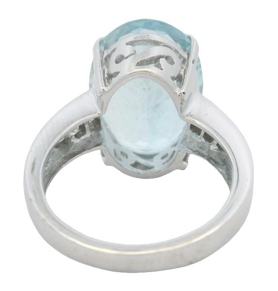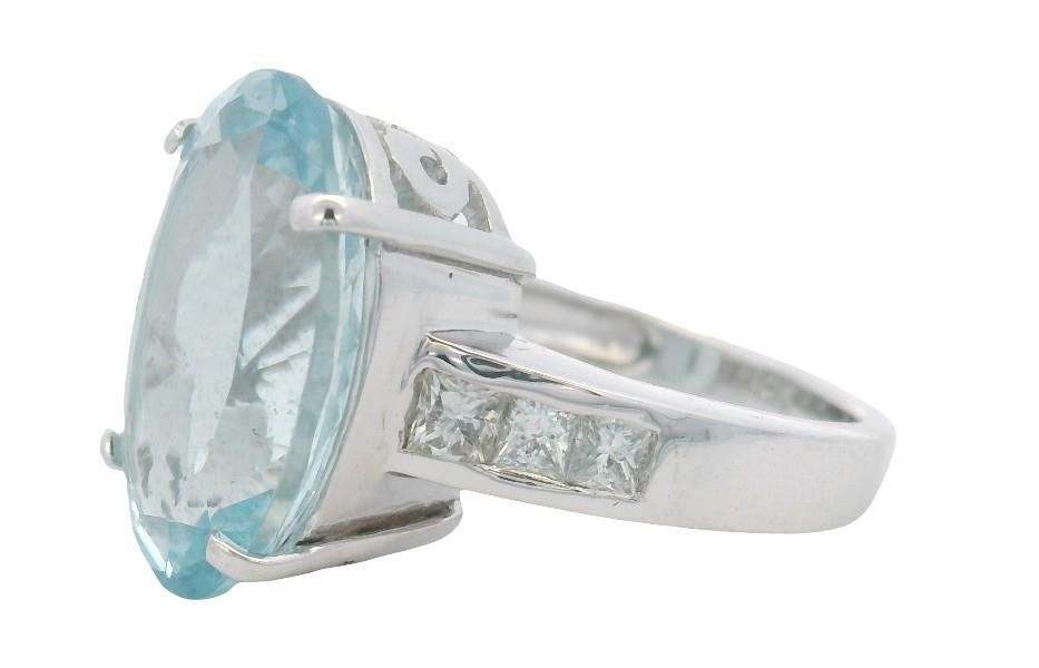 18ct white gold, featuring an oval cut Aquamarine of 8.35ct, light to medium blue, claw set, decorative side basket, flanked by six round brilliant cut Diamonds, totalling 0.64ct, channel set to the top of the shoulders, merging into a square edge band. Ring size: L1/2. Valuation on request. Total Weight: 6.8g