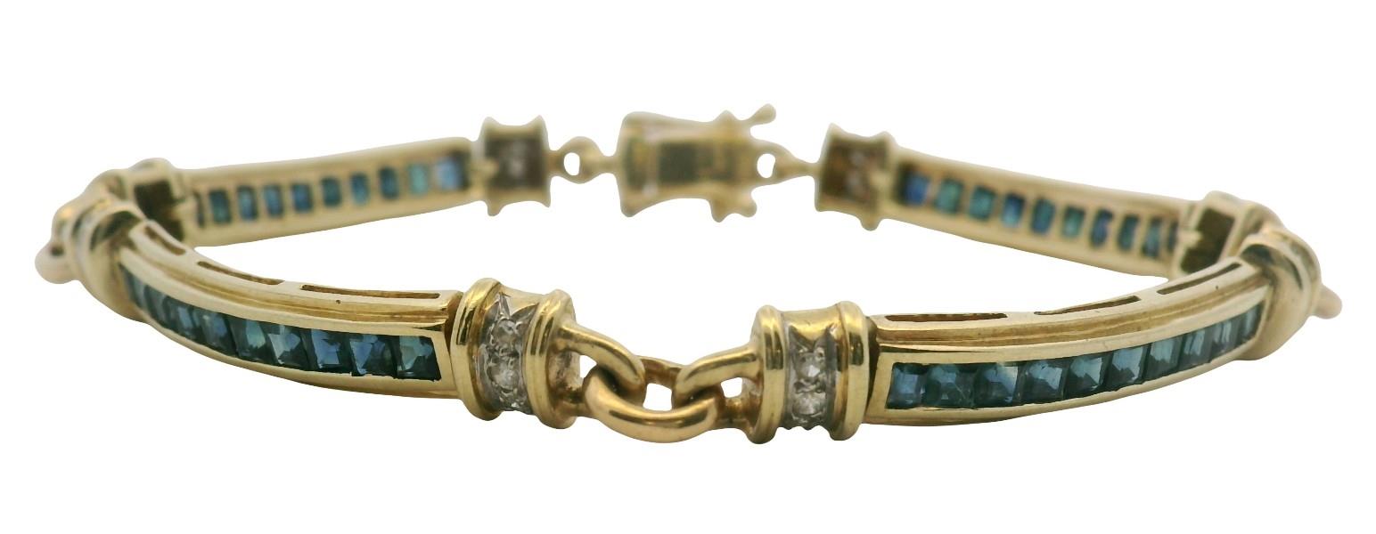 A CARRE CUT SAPPHIRE & DIAMOND DETAILED 18K YELLOW GOLD BRACELET, WEIGHING 15.5GRAMS