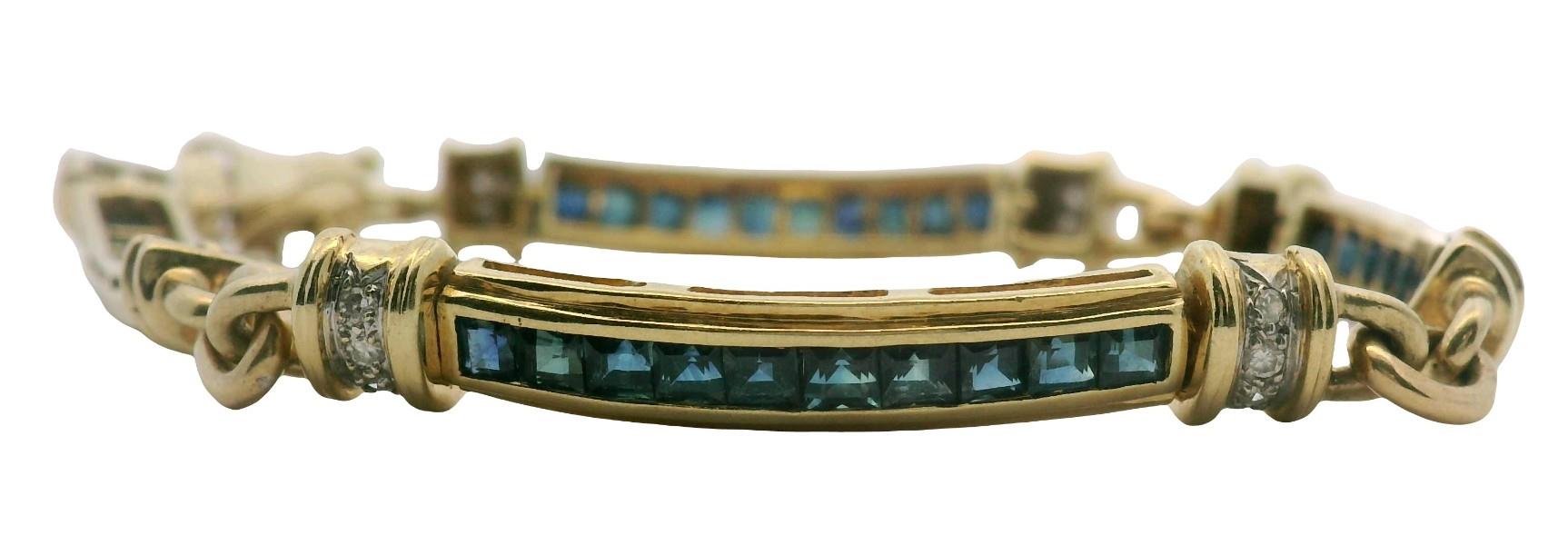 18ct yellow gold stamped 18k 750, featuring four slightly curved rectangular shaped bar links, each measuring 35mm, channel set centrally with carre cut sapphires of medium blue colour, edged in gold with stepped profile, capped by smaller diamond set rondelles with raised sides, articulated and fitted with slide clasp and double safety catches. Length: 17.7cms