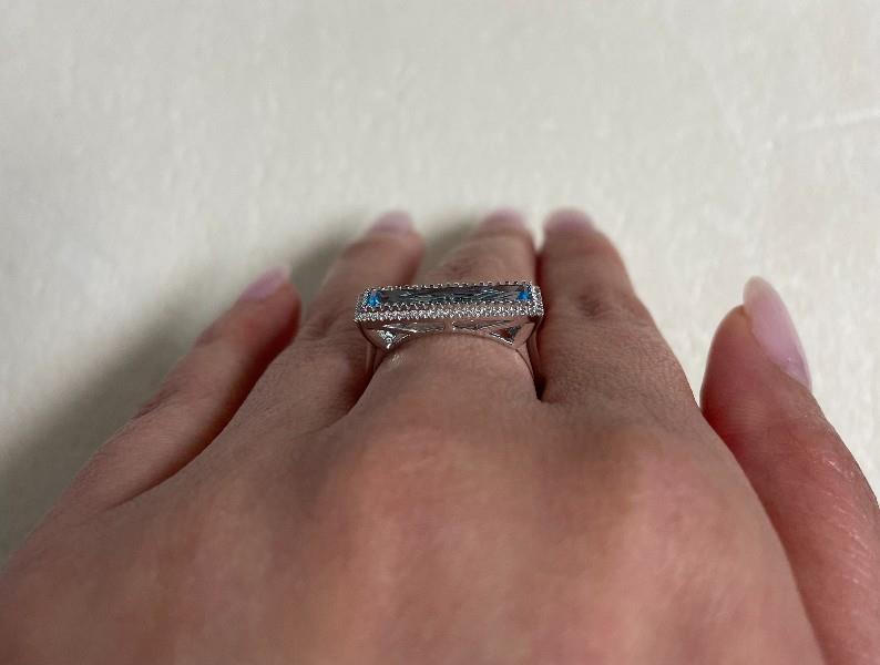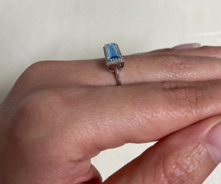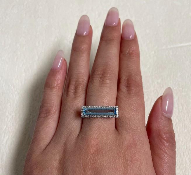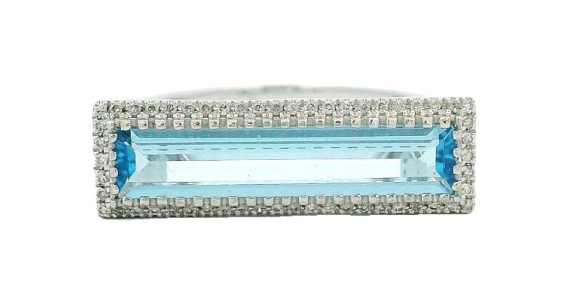 AN 18K W.G RECTANGULAR AQUAMARINE OF 1.36CT & DIAMOND(0.080CT) BAR RING, SIZE: N, T.W.: 2.8GRAMS