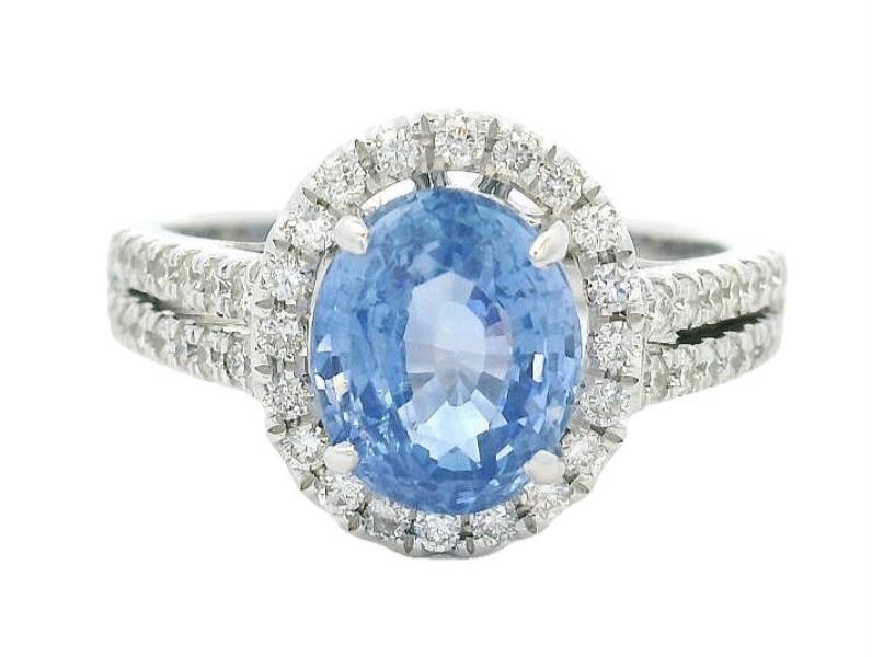 AN 18K W.G OVAL CUT SAPPHIRE OF 2.69CT & DIAMOND(.47CT) CLUSTER RING, SIZE: L1/2, T.W.: 5.5GRAMS