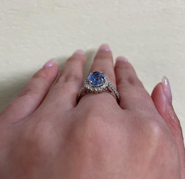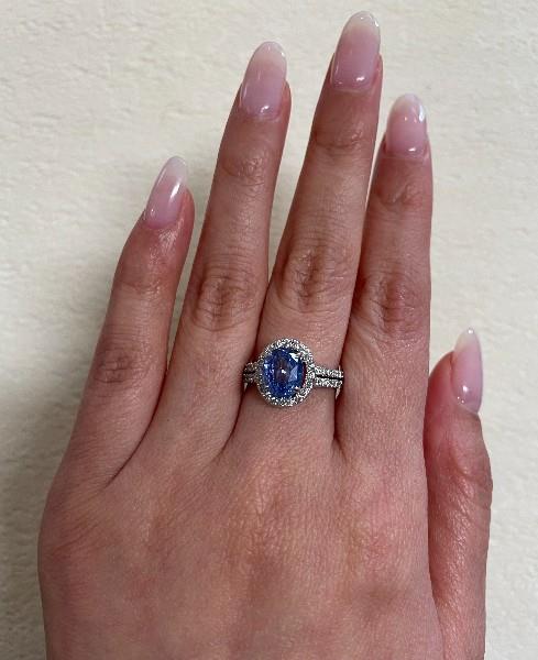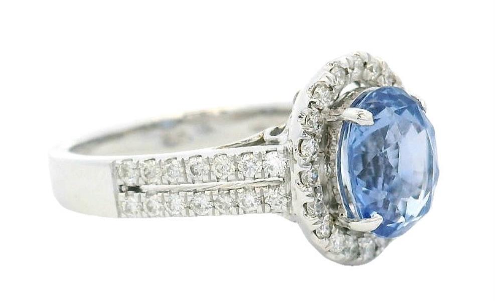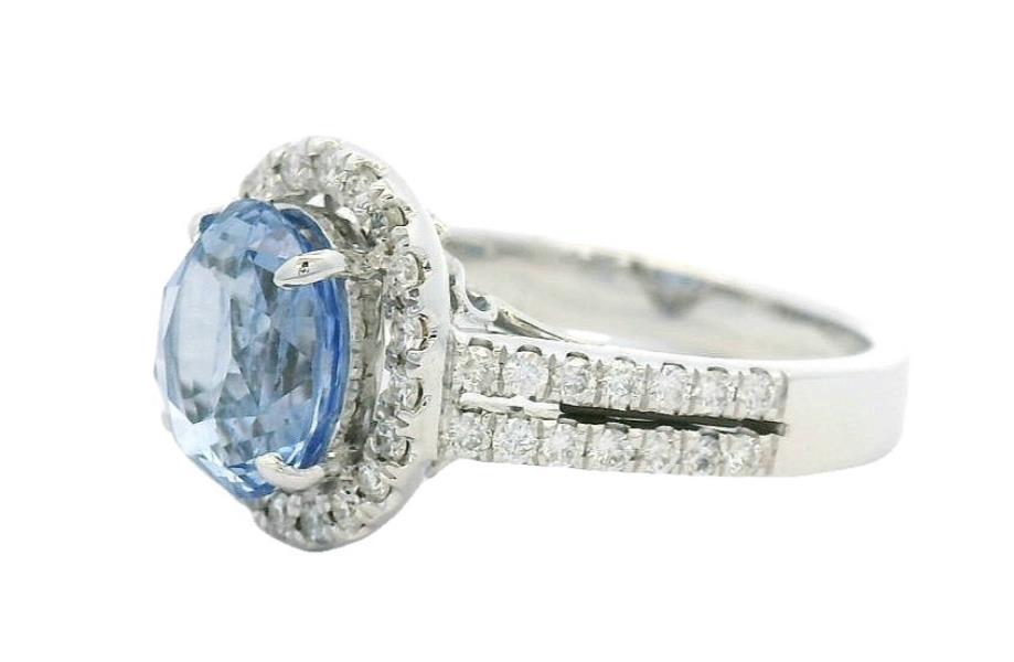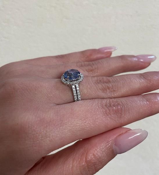 18ct white gold, featuring an oval cut Sapphire, totalling 2.69ct, fancy colour blue purple tones, claw set, surrounded by a cluster of round brilliant cut Diamonds, extending to two rows across the shoulders, totalling 0.47ct, claw set to mount, small centre split between the rows, merging into a modern square band. Ring size: L1/2. Total Weight: 5.5g