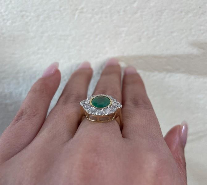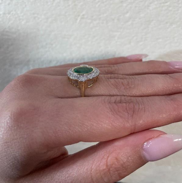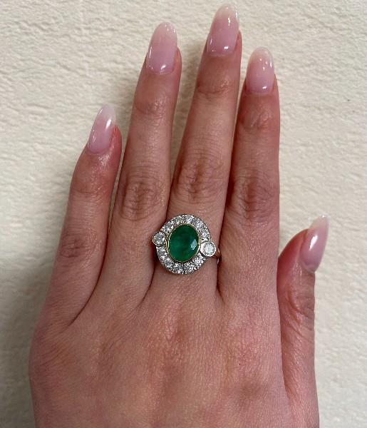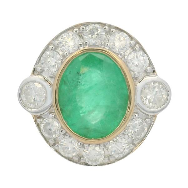 14ct yellow and white gold, featuring an oval cut Emerald of 2.02ct, bezel set, flanked by two round brilliant cut Diamonds, bezel set, surrounded by round brilliant cut Diamonds, multi bead set, smooth edges, slope shoulders, merging into a fine polished band. Ring size: M1/2. Valuation on request. Total Weight: 3.5g