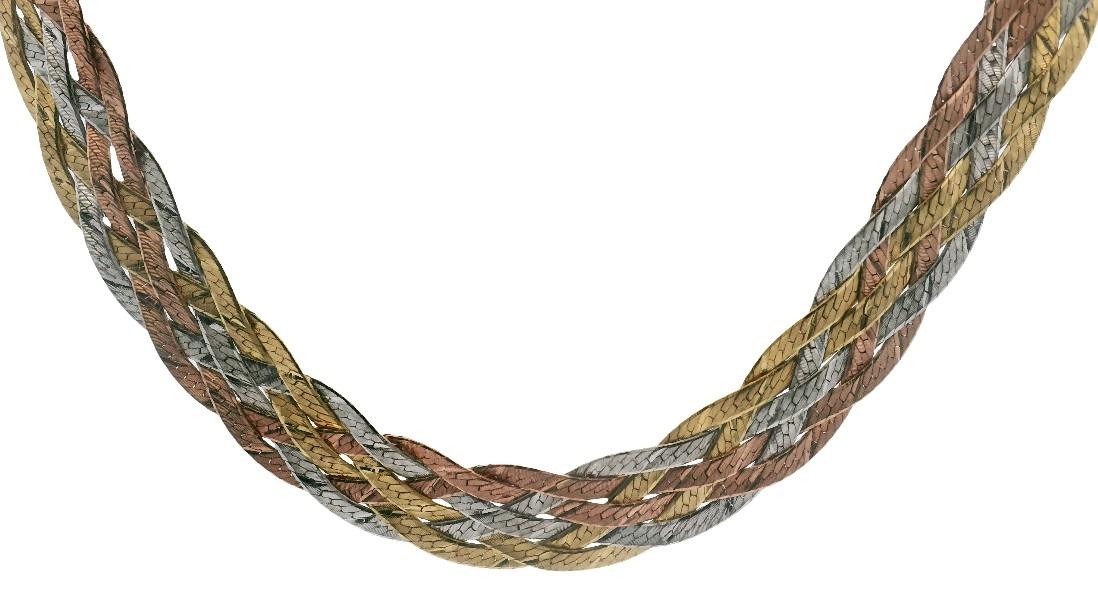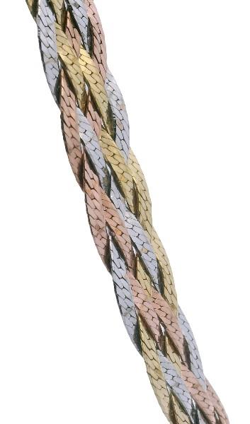 A WOVEN TRI COLOUR ITALIAN 9K Y/R/W GOLD NECKLACE, LENGTH: 45CM, WEIGHING 17GRAMS