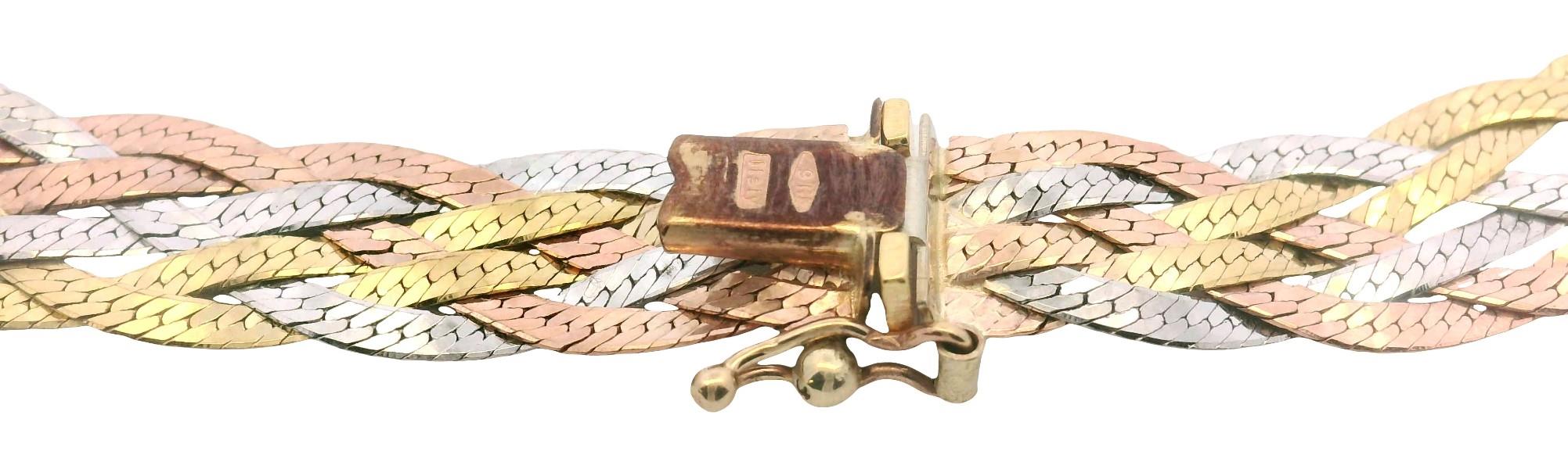 9ct yellow, rose and white gold, stamped Italy, presented as a multi six strand flat woven bracelet of bright cut etched gold in three colours, plait like pattern, capped and fitted with concealed clasp and safety catch. Length: 45cms