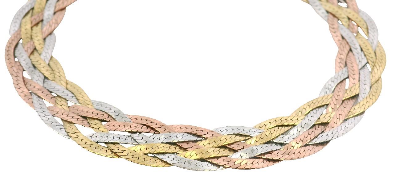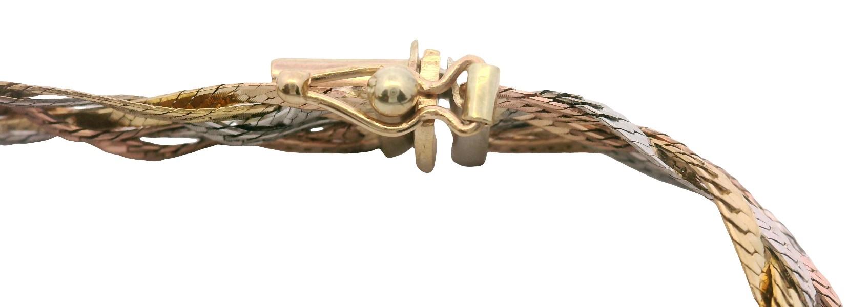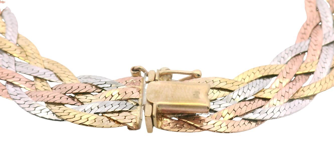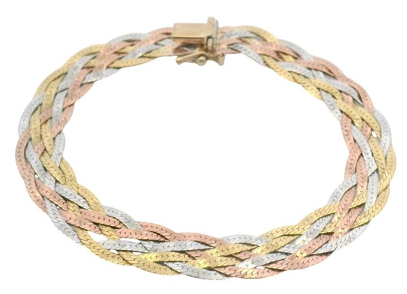 A WOVEN TRI COLOUR ITALIAN 9K Y/R/W GOLD BRACELET, LENGTH: 18CMS, WEIGHING 7.4GRAMS