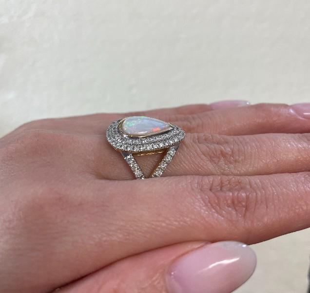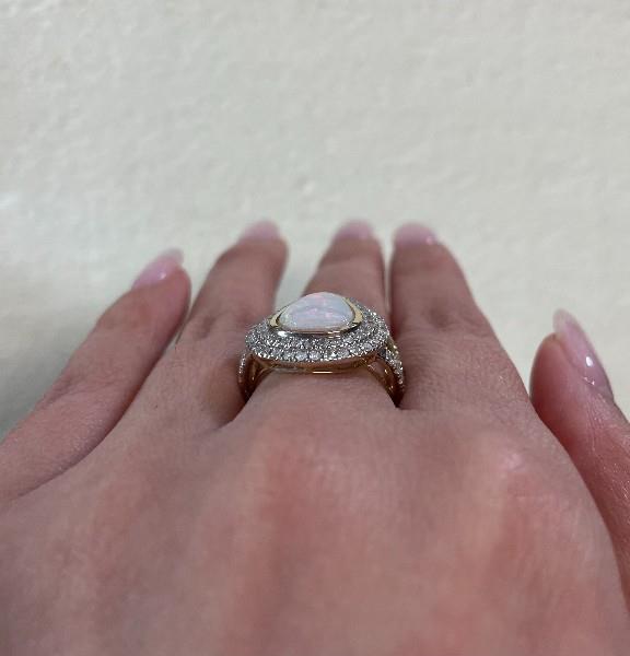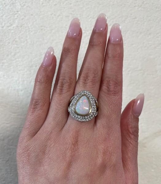 14ct yellow gold, featuring a pear shape white opal cabochon, totalling 2.15ct, complete spectra of play of colours, bezel set, surrounded by a double halo of round brilliant cut Diamonds, extending to the shoulders, totalling 1.06ct, claw set in white gold, slight dome profile, wide split shoulders, merging into a simple half round band. Ring size: M1/2. Valuation on request. Total weight: 5.6g