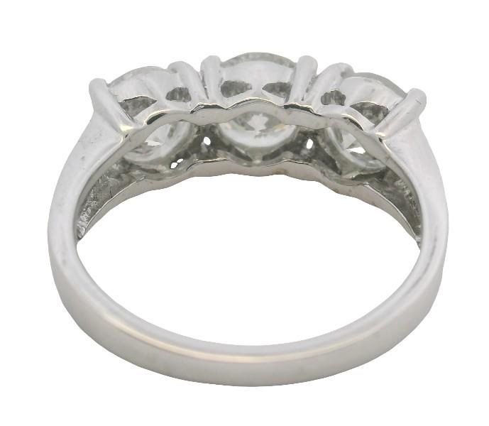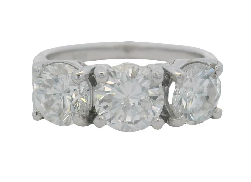 18ct white gold, featuring three round brilliant cut Diamond of similar sizes, totalling 3.12ct, claw set, lined in individual basket set, wide drop shoulders, merging into a slight taper band towards the back. Ring size: M. Valuation on request. Total weight: 5.3g