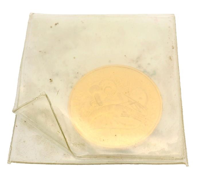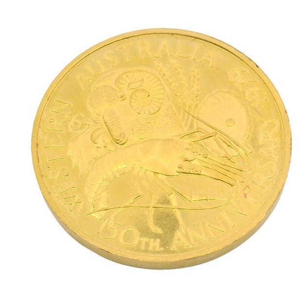 24ct yellow gold, commemorating the anniversary of the Swan River Colony, measuring 27mm in diameter, weighing 20.94grams, various WA motif depicted along with Captain James sterling to reverse. With original plastic labelled sleeve.