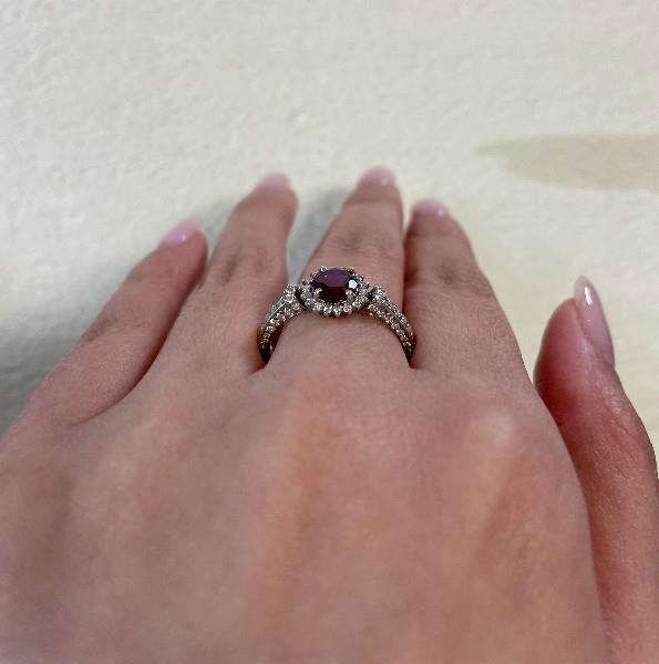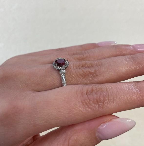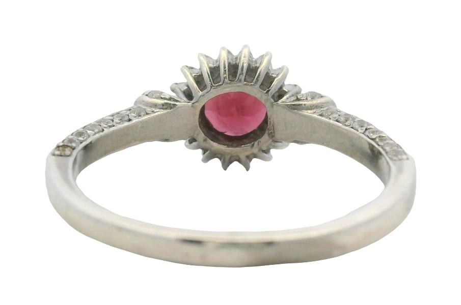 Sterling silver, low profile, featuring a round cut Garnet of approximately 0.80ct, claw set, medium strong red purple tones, surrounded by radiating marquise cut Diamonds from the centre, outer claw set, extending to side bars, ridged edges, accompanied by Diamond encrusted shoulders and mount, shared bead set, merging into a polished semi round band to polished inner band. Ring size: R. Total Weight: 2.8g