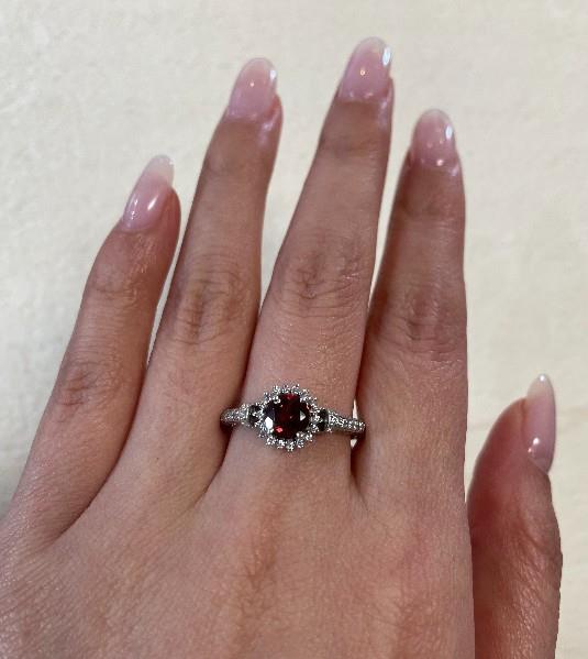 A STERLING SILVER ROUND CUT GARNET OF .80CT & DIAMOND FLORAL CLUSTER RING, SIZE: R, T.W.: 2.8GRAMS