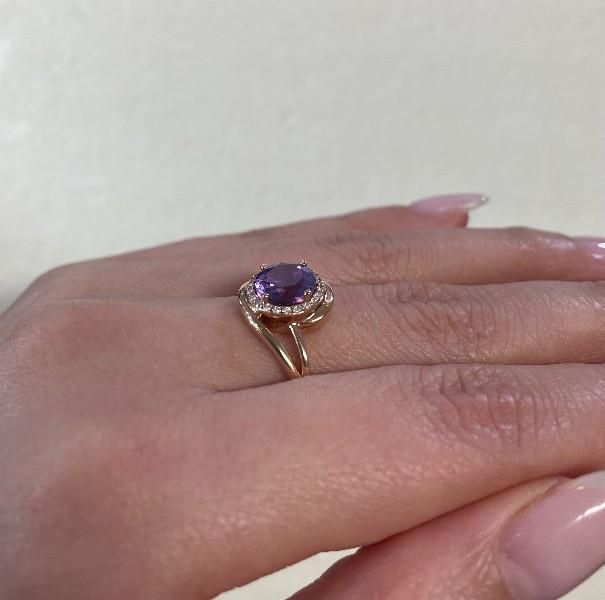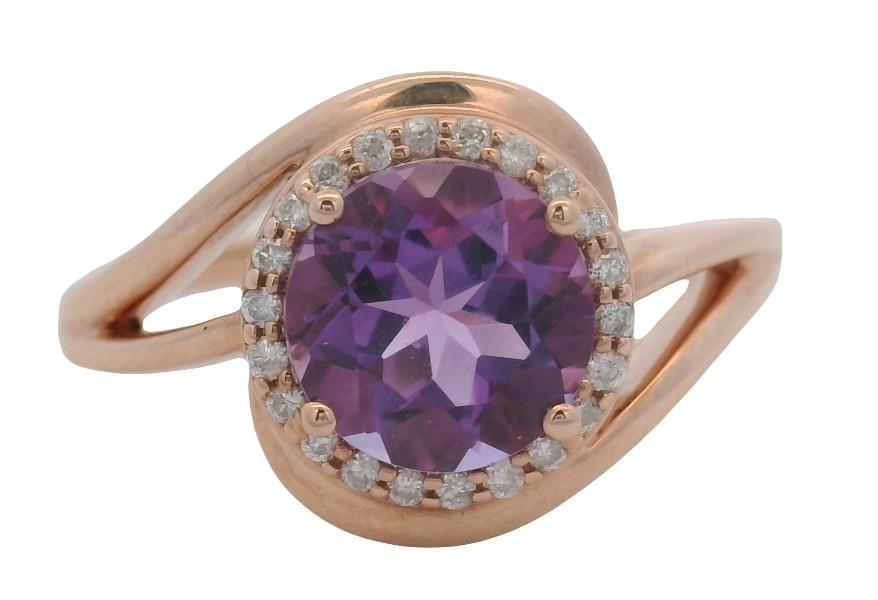 14ct rose gold, featuring a centre round cut Amethyst of 1.77ct, claw set, surrounded by a halo of round brilliant cut Diamonds, totalling 0.11ct, shared bead set to mount, enclosed by a wave band, opposites waves to each side, making up the split shoulders, merging into a half round band. Ring size: N1/2. Valuation on request. Total Weight: 4.2g
